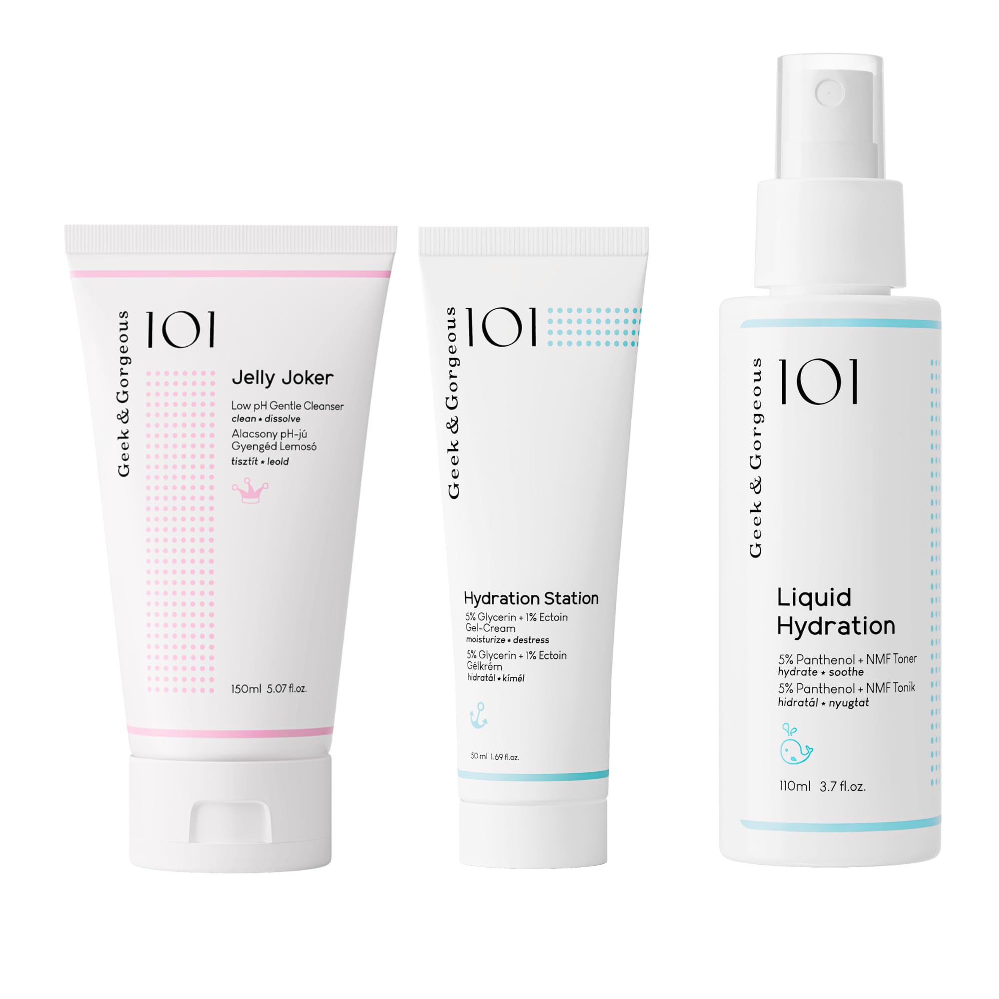 Beat the summer heat with Geek Gorgeous' Summer Skin Rescue Bundle – your go-to trio for clean, calm, and fully hydrated skin. Whether you're tackling oily T-zones, post-sun dehydration, or simply looking for a featherlight skincare routine, this bundle delivers a complete, skin-loving ritual without the weight. Start with Jelly Joker, a soothing, non-foaming gel cleanser with a skin-friendly pH and ultra-mild surfactants to melt away sunscreen, makeup, and grime—without drying out your skin. Follow up with Liquid Hydration, a refreshing facial mist powered by panthenol and skin-identical moisturizers like amino acids and urea. It quenches thirsty skin in seconds and layers perfectly under other products. Seal it all in with Hydration Station, a silky-smooth gel cream that hydrates with glycerin and ectoin while fortifying your barrier with sugar-derived isosorbide dicaprylate. Lightweight and breathable, it's the ideal moisturizer for sticky summer days and oil-prone complexions. Together, these three bestsellers create a smart, minimalist routine for morning or night—tailored to sensitive skin, yet powerful enough for visible results. Get clean, refreshed, and deeply hydrated skin this summer, minus the weight.SKIN-LOVING, CONSCIOUS FORMULAS – All three products are fragrance-free, vegan, cruelty-free, gluten-free, essential oil-free, alcohol-free, and pregnancy-safe. Made in the EU with clinically tested, high-performance actives. LIGHTWEIGHT MOISTURE FOR HOT WEATHER – Hydration Station gel cream is a summer favorite: fast-absorbing, oil-free, and powered by glycerin, ectoin, and isosorbide dicaprylate for healthy, bouncy, moisture-plumped skin. REFRESHING HYDRATION TONER MIST – Liquid Hydration delivers lightweight, layerable hydration with 5 panthenol and a blend of Natural Moisturizing Factors (NMFs) like urea and amino acids. Ideal for reviving dehydrated, sun-exposed skin. GENTLE HYDRATING CLEANSER – Jelly Joker is a low pH, non-foaming gel cleanser that removes makeup and impurities without stripping the skin. Enriched with panthenol and allantoin to calm and soothe all skin types—even sensitive. ALL-IN-ONE SUMMER SKINCARE ROUTINE – Your 3-step essential bundle for clean, fresh, and deeply hydrated skin. Designed to gently cleanse, refresh, and moisturize without heaviness—perfect for hot, humid weather.