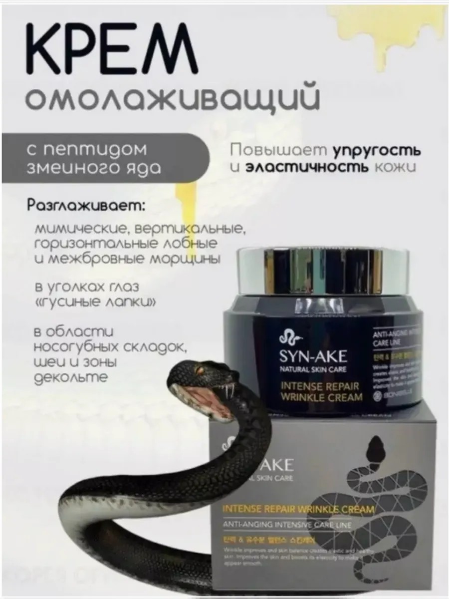 Антивозрастной крем с пептидом змеиного яда – средство для ухода за кожей лица, которое обладает омолаживающим действием. Питательный крем на основе пептида змеи против морщин и пигментных пятен. Синтетический компонент, созданный на основе яда гадюки, разглаживает первые морщинки и снижает эффект гусиных лапок. Обладает увлажняющим и омолаживающим эффектом благодаря активным компонентам корню женьшеня и аденозину. Уникальное сочетание веществ способствует обновлению клеток и укреплению мышц, имитирующих воздействие ботокса. Влияет на мускулатуру, расслабляя и блокируя мышцы и придает упругость и лифтинг эффект. Укрепляет контуры овала и замедляет появление мелких морщин, предотвращая возрастные изменения. Регулярное использование средства утром и вечером позволяет осветлить пигментные пятна и устранить следы усталости.