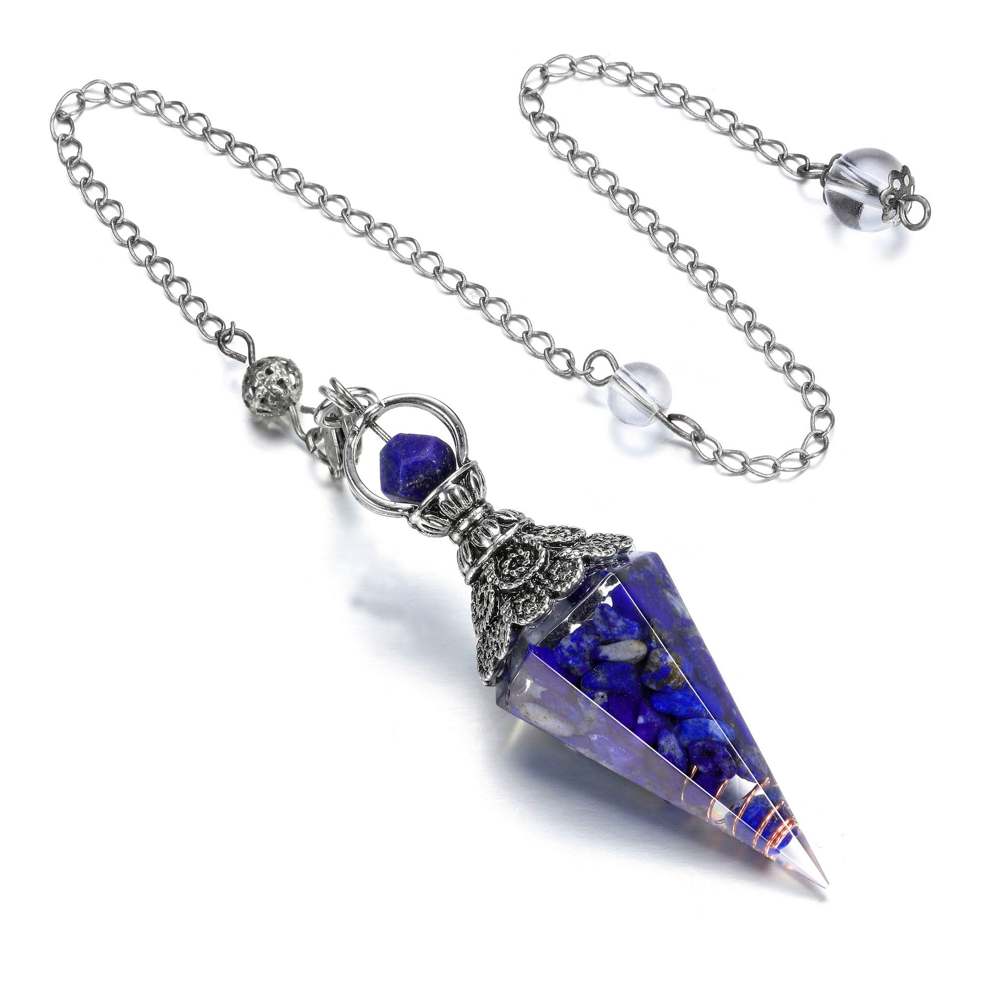?Perfect Choice for Gift? -- This crystal pendulum is the best gift to your parents, families, friends, couples and yourself. It's avaliable for reiki healing, meditation, chakra balancing, energy charged, tarot, wicca, dowsing, divination, witchcraft ritual or room decoration. ?Pendulum Size Detail? -- The pendulum size about: Length: 2.48-2.52 inches(63-64mm), Width: 0.67-0.69 inches(17-17.5mm). The Chain Length: 9 inches(229mm). Total length(with chain) about 11.5 inches(292mm). Weight about 15g(0.5oz). Please notes: All the stones are natural, the size and color may be vary according to the stones. ?Natural Lapis Lazuli? -- Lapis Lazuli is regarded as the most powerful stone, which can bring good luck and increases the strength of intuition and judgment. It helps clearing mind, bringing inspiration for creativity, effective on keeping calm and strengthen confidence. Furthermore, it corresponding to the 'third eye', which can open the window of the soul, strengthen the ability of insight and perspective things inherent instinct. Also easily eliminate eye fatigue and protect eyesight. ?Dowsing Pendulum for Divination? -- By using your mindfulness, this pendulum pendant can give you a direction which can tell the answers you want to know and sense the magnetic field around you. You can make a mysterious exploration by using crystal pendulum. It is just like a compass leading you when you using it. ?Reiki Healing Crystals Pendulum? -- This pendulum is made of natural gemstone chips, copper wires, and surface used of resin. With silver stainless steel chain. It’s helpful to improve the accuracy and sensitivity of dowsing. Also great for crystals healing, spiritual protection, chakra energy balancing, pagan blessings, meditation, reduce the negative, etc. Different crystals can bring different functions.