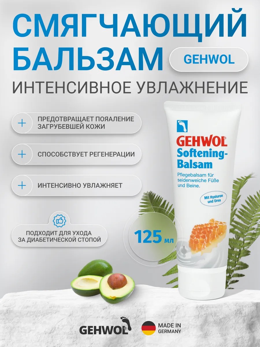 Ухаживающий бальзам от Геволь с гиалуроновой кислотой Молоко и мед, экстрактом меда и молочными протеинами оказывает эффективное увлажняющее и смягчающее действие, придавая коже мягкость и эластичность. Благоприятно действующие на кожу липиды в комбинации с питательным маслом авокадо и гиалуроновой кислотой, произведенной по специальной биотехнологии, способствуют регенерации кожи и усиливают ее защитные свойства.Гиалуроновая кислота в сочетании с мочевиной удерживает влагу в глубоких слоях кожи и предотвращает появление загрубевшей кожи.Важными компонентами бальзама являются витамин Е, масло авокадо и фарнезол. Результат – шелковистая, гладкая и ухоженная кожа ног и стоп.*Способ применения: наносите бальзам Gehwol лёгкими движениями один-два раза в день на чистую кожу ног и стоп, а также между пальцами. Массируйте до полного впитывания.