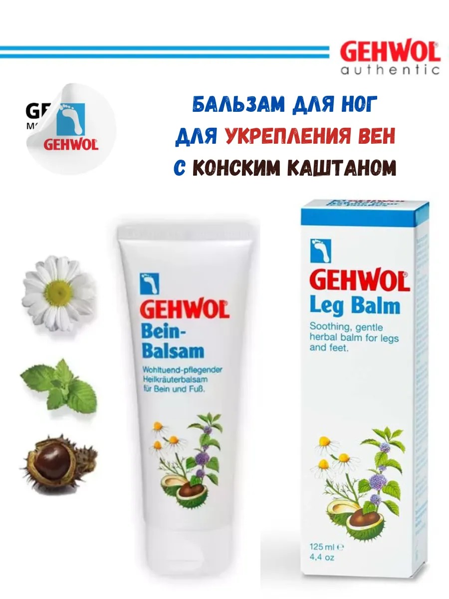 Геволь Бальзам для ног и стоп Gehwol Leg Balm (Bein Balsam). Для всех типов кожи. Показания: - Усталость и напряжение в ногах. - Сосудистые “звездочки”. - Профилактика тромбофлебита и грибковых инфекций. - Судороги во время беременности. / Результат: - Свежая, эластичная и упругая кожа. - Ощущение приятной прохлады. - Нет тяжести и напряжения в ногах. - Укрепление сосудов. / Избавиться от усталости, чувства тяжести в ногах, а также укрепить сосудистые стенки поможет Gehwol Leg Balm. Уникальная рецептура средства способствуют нормализации кровообращения, улучшению обменных процессов в тканях, предупреждает варикозное расширение вен и образование сосудистых «звездочек». Нежная невесомая консистенция обеспечивает легкое нанесение и быстрое проникновение активных компонентов, не оставляя липкости и жирности на коже. / Бальзам для ног и стоп Геволь отлично подойдет для устранения усталости после трудового дня, защиты вен и сосудов от перегрузок во время тренировок, а также для профилактики тромбофлебита. Натуральный состав средства позволяет его использовать во время беременности для предупреждения возникновения судорог. / Продукт проявляет противогрибковую активность, защищает от неприятного запаха и уменьшает потливость ног. Сразу после нанесения вы почувствуете приятную свежесть и комфорт. / Активные компоненты: - Аллантоин укрепляет стенки сосудов, нормализует кровообращение; - Бисаболол успокаивает, восстанавливает и смягчает дерму; - Экстракт гамамелиса способствует устранению сосудистых «звездочек»; - Пантенол смягчает и заживляет кожу. / Способ применения: Нанесите средство на чистую и сухую кожу ног и ступней легкими массирующими движениями. Для укрепления стенок сосудов проводите самомассаж с использованием средства.