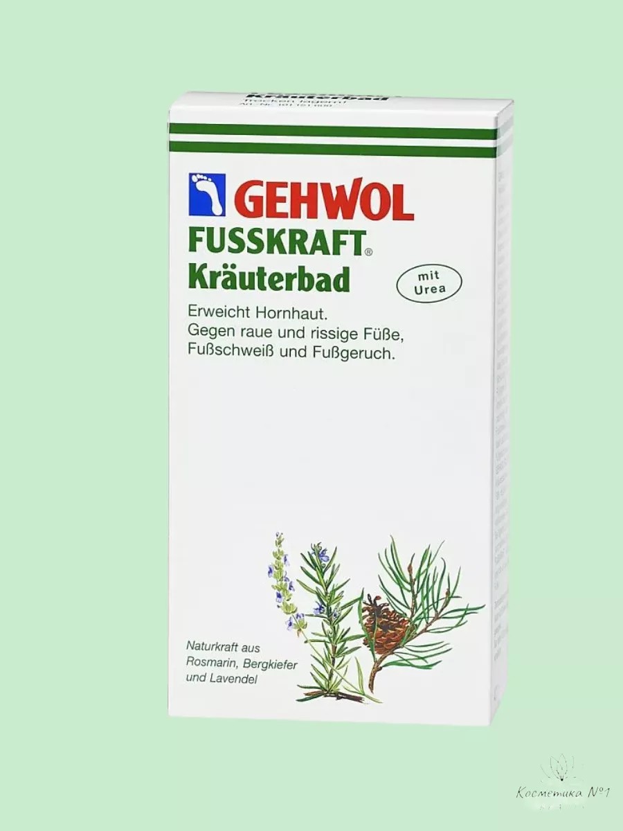 Средство Травяная ванна Геволь (Fusskraft Herbal Bath Gehwol) с натуральными ингредиентами из трав и масла горной сосны. Ее основное воздействие направлено на нормализацию процесса потоотделения и продолжительное действие против запаха пота. Ванна также обладает сильными смягчающими свойствами и предназначена для размягчения чрезмерно жёсткой кожи ступней, мозолей, натоптышей, загрубевшей и растрескавшейся кожи ног.