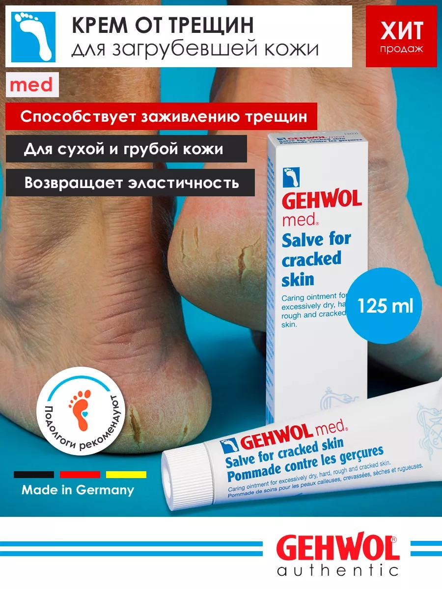 Профессиональная мазь крем от трещин Геволь подойдет для ухода за сухой, потрескавшейся, загрубевшей и повреждённой кожей ног и стоп. Входящие в состав пантенол, бисаболол, питательные жиры и натуральные эфирные масла лаванды, розмарина и эвкалипта оказывают противовоспалительное действие и ускоряют процес с заживления трещин на пятках, руках и ногах. Регулярное применение крема от трещин защитит потрескавшуюся кожу от инфицирования и шелушения, облегчит её болезненное состояние и возвратит естественную эластичность. Мазь от трещин Gehwol также размягчает натоптыши разной степени сложности за счет кастората калия и питательных жиров (ланолина) в составе.