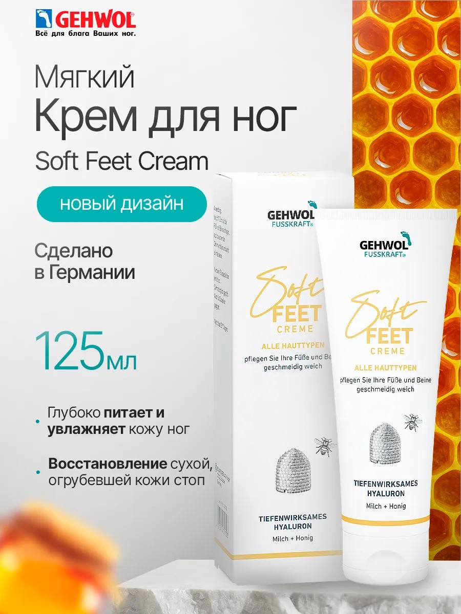 GEHWOL Fusskraft Soft Feet Creme «Молоко и Мед» — профессиональный уход за кожей ног в домашних условиях. Крем обладает нежной шелковистой текстурой, быстро впитывается и не оставляет жирного блеска. Благодаря активным компонентам — молочному протеину, витамину Е и натуральному меду — крем глубоко увлажняет и восстанавливает кожу стоп, смягчает огрубевшие участки, снимает чувство усталости и дискомфорта.