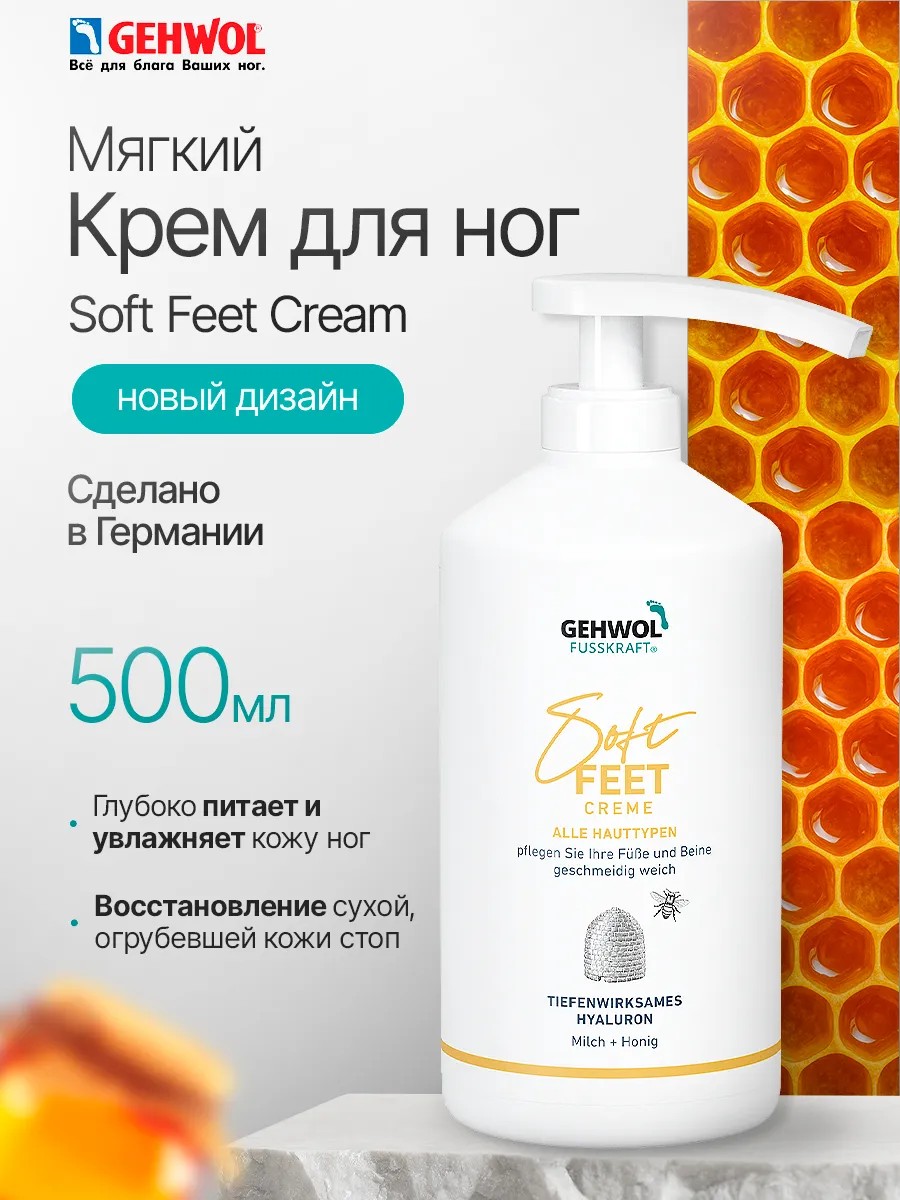 GEHWOL Fusskraft Soft Feet Creme «Молоко и Мед» — профессиональный уход за кожей ног в домашних условиях. Крем обладает нежной шелковистой текстурой, быстро впитывается и не оставляет жирного блеска. Благодаря активным компонентам — молочному протеину, витамину Е и натуральному меду — крем глубоко увлажняет и восстанавливает кожу стоп, смягчает огрубевшие участки, снимает чувство усталости и дискомфорта.