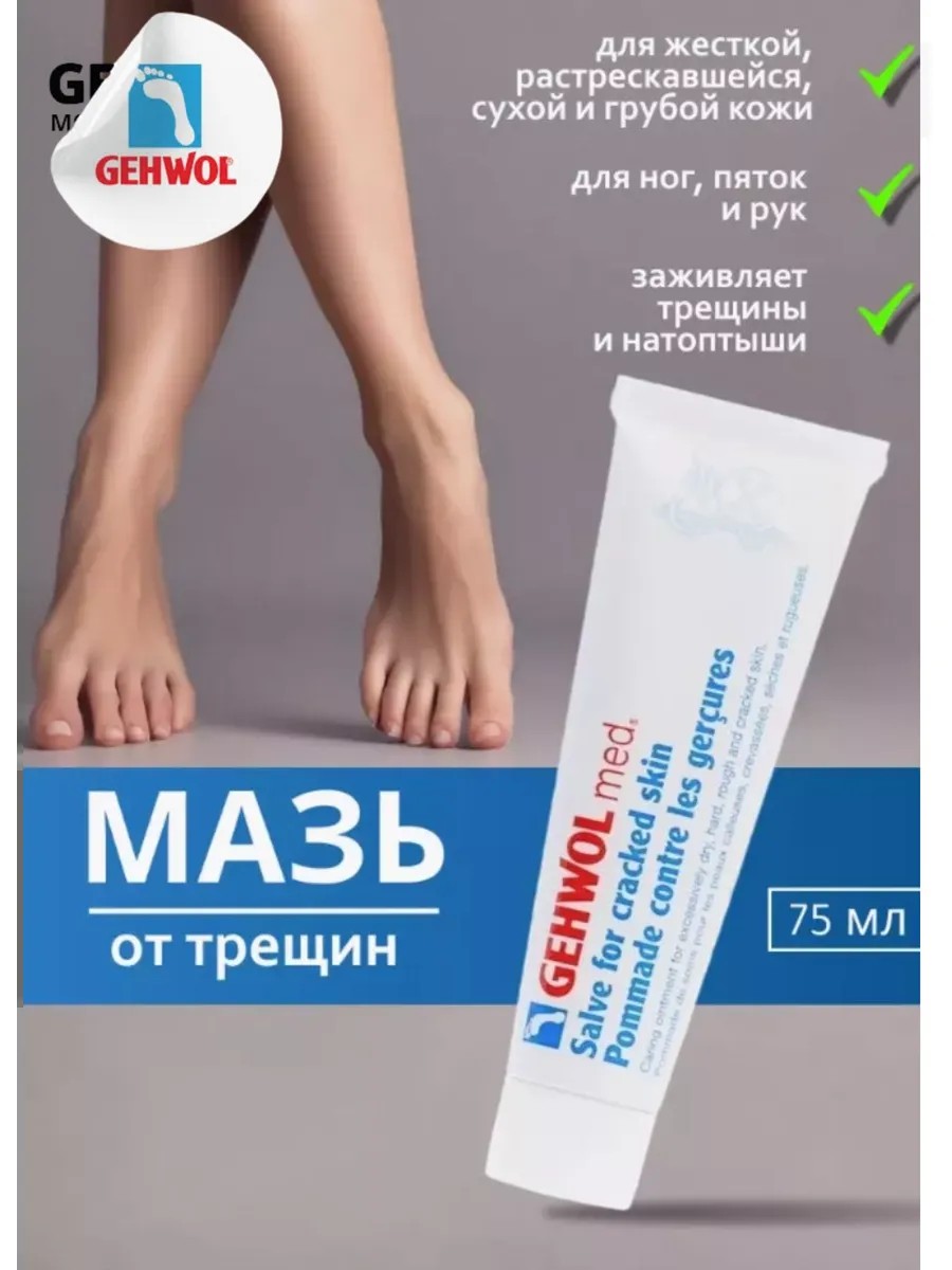Косметологи компании Gehwol позаботились о здоровье стоп, склонных к глубоким трещинам, и разработали Salve For Cracked Skin - мазь широкого спектра действия. При регулярном применении средства вы навсегда забудете о загрубевшей коже, трещинах, мозолях и болезненных ощущениях при ходьбе. / Комплекс эфирных масел, пантенол, ланолин и бисаболол помогают устранить сухость и шелушение стоп, ускоряют обновление и регенерацию поврежденных участков. Эфирные масла обеспечивают надежную защиту от грибков. Благодаря ценным активным компонентам заживляющая мазь от трещин Геволь Мед поможет быстро устранить ранки и трещины на стопах. / Продукт также подходит для лечения потрескавшейся кожи рук. / Активные компоненты: - розмариновое эфирное масло обладает противовоспалительными, обезболивающими и антисептическими свойствами; - лавандовое эфирное масло регенерирует, обновляет клетки эпидермиса, снимает воспаления, шелушения и отечность, препятствует росту бактерий; - эвкалиптовое эфирное масло уничтожает бактерии и подавляет их рост, снимает воспаления; - ментол освежает и дезодорирует; - пантенол заживляет поврежденную дерму; - ланолин смягчает огрубевшую кожу, помогает бороться с мозолями и трещинами, удерживает влагу в глубоких слоях эпидермиса; - бисаболол делает кожу мягкой, эластичной, дезинфицирует и восстанавливает ее./ Способ применения: Наносите 1 раз в день, лучше на ночь, по возможности предварительно удалив огрубевший слой кожи. После полного впитывания мази наденьте на стопы хлопковые носочки для лучшего эффекта.