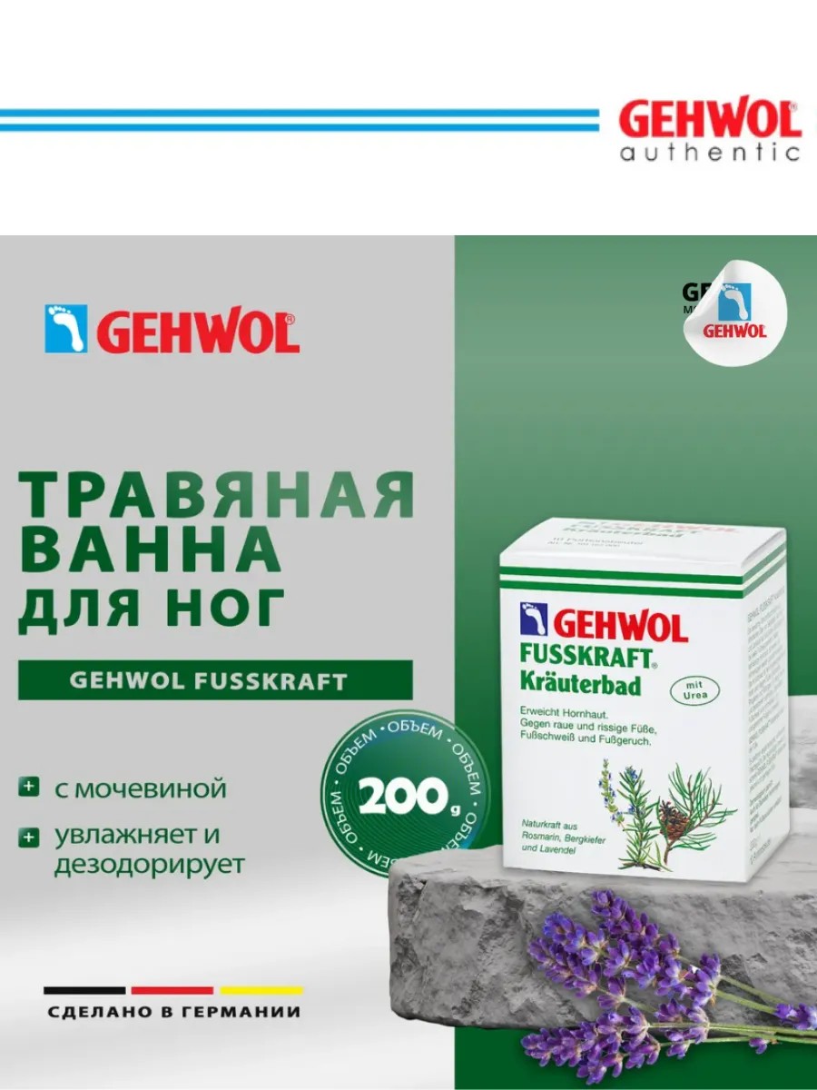 Gehwol Fusskraft Herbal Bath for feet. The Fusskraft line offers exclusive professional foot care to solve any problem. For all skin types. Indications: - Excessive sweating, unpleasant odor. - Dry, rough skin. - Calluses, corns. / Result: - Feet are prepared for a pedicure. The skin is soft, there is no unpleasant odor. / A warm, aromatic Gehwol Fusskraft Herbal Bath for feet will help relieve accumulated fatigue, improve skin health, and normalize sweating. The product's formula, based on urea and a composition of natural essential oils, will provide your feet with an excellent softening and deodorizing effect. Gehwol Fusskraft Herbal Bath for feet facilitates the process of removing calluses and corns, and also prepares feet for a pedicure. / If you want to pamper your body with a relaxing spa treatment, feel free to add a small amount of the product to your bath water and enjoy the healing aroma of herbs. / Active ingredients: - Urea softens the skin, exfoliates, fights pathogenic fungi and bacteria; - Rosemary essential oil has anti-inflammatory, analgesic and antiseptic properties; - Lavender essential oil regenerates and renews epidermal cells, relieves inflammation, flaking and swelling, and inhibits bacterial growth; - Eucalyptus essential oil destroys bacteria and inhibits their growth, relieves inflammation; - Camphor activates blood circulation and neutralizes unpleasant odor. / Directions for use: Dissolve 1 sachet of the product in 3 liters of warm water. Soak your feet in the solution for 10-15 minutes or longer if necessary. The product can be used for a full body bath.