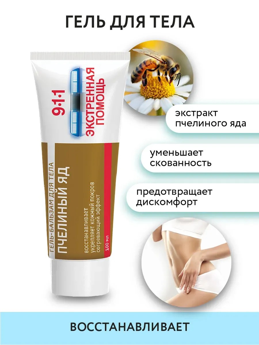Гель-бальзам для тела с Пчелиным ядом из Серии 911 улучшает обменные процессы, способствуя восстановлению и уменьшению чувства скованности. Крем предотвращает дискомфортные ощущения, обладает согревающим эффектом, способствуя благотворному воздействию на кожный покров. Гель - бальзам предназначен для заботливого ухода за кожей тела, особенно рекомендован для кожи ног и спины. Пчелиный яд известен своими лечебными свойствами. Согревающий эффект пчелиного яда помогает снять напряжение и дискомфортные ощущения в области тела. Сочетание растительных экстрактов, таких как окопник и сабельник, делает этот гель-бальзам хорошим выбором для ухода за вашей кожей. Он помогает смягчить и увлажнить кожу, оставляя ее гладкой и сияющей. Кремообразная текстура бальзама обеспечивает комфортное нанесение и быстрое впитывание в кожу. Этот гель-бальзам для тела с пчелиным ядом является незаменимым помощником в уходе за вашей кожей при ощущениях дискомфорта. Меры предосторожности: избегать попадания в глаза и на слизистые оболочки. При попадании тщательно промыть большим количеством теплой воды. Только для наружного применения. Возможна индивидуальная непереносимость компонентов. Не является лекарственным средством.