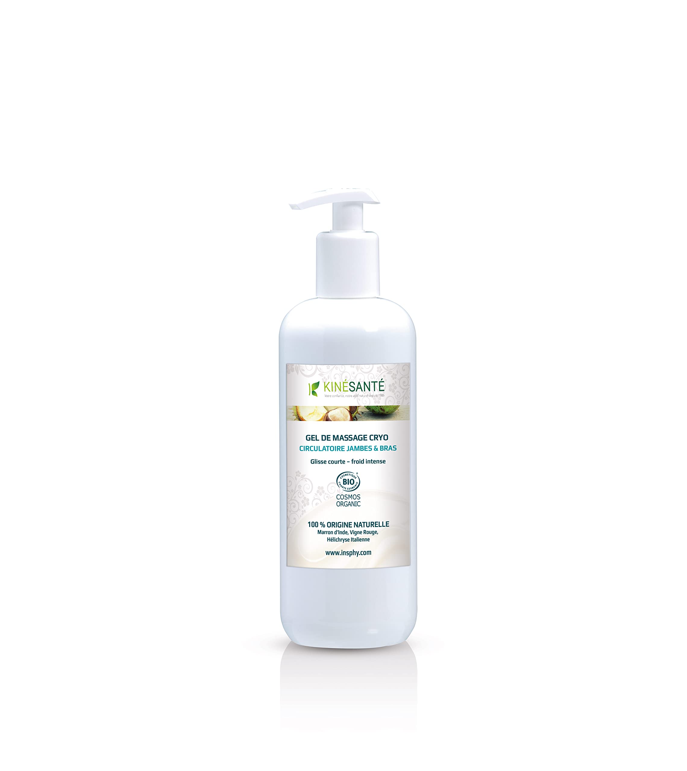 KINÉSANTÉ Cryo Circulatory Leg Arm Gel, COSMOS ORGANIC certified, is specifically formulated for circulatory care for patients and athletes. Highly concentrated in plant extracts and essential oils, it provides an intense cooling sensation that delivers rapid relief. This contact cryotherapy promotes recovery for athletes after strenuous exercise and optimizes their maintenance between competitions. It can be used in short massages, applied as a thin layer in occlusive or non-occlusive wraps, or under compression boots, protecting them with inner boots. Its fluid texture is quickly absorbed by the skin. It contains mother tinctures of red vine, witch hazel, and horse chestnut camphor rosemary hydrosol organic and chemotyped essential oils of true lavender, German chamomile, patchouli, green cypress, Italian helichrysum, mastic, and peppermint camphor and natural menthol. Ingredients: Aqua, Alcohol , Menthol , Caprylic Capric Triglyceride, Glycerin, Rosmarinus Officinalis Flower Leaf Stem Water , Aesculus Hippocastanum Extract , Hamamelis Virginiana Leaf Extract , Vitis Vinifera Leaf Extract , Menthyl Lactate, Mentha Piperita Oil , Cupressus Sempervirens Leaf Nut Stem Oil , Helichrysum Italicum Flower Oil , Lavandula Angustifolia Herb Oil , Lavandula Angustifolia Oil , Pistacia Lentiscus Leaf Oil , Pogostemon Cablin Leaf Oil , Chamomilla Recutita Flower Oil , Camphor, Sodium Stearoyl Glutamate, Carrageenan, Xanthan Gum, Citric Acid, Linalool, Limonene, Geraniol. From organic farming. Processed from organic ingredients. 21.92 of the total ingredients are from Organic Farming. 100 of the total ingredients are of natural origin. COSMOS ORGANIC Certified by Cosmécert according to the COSMOS standard. This product is labeled "Cruelty-free vegan". KINÉSANTÉ is the professional range from Laboratoire INSPHY.Made in France, in the South of France. Natural camphor. Organic menthol. Menthyl lactate. Organic camphor rosemary hydrosol. Organic mother tinctures of witch hazel, horse chestnut, and red vine. 100 pure, natural, and organic chemotyped essential oils of true lavender, German chamomile, patchouli, green cypress, Italian helichrysum, mastic, and peppermint. For topical application and body wraps. Massages of 5 to 10 minutes. Professional cryo-gel for intense cooling. Relieves heavy legs.Le Gel Cryo Circulatoire Jambes Bras KINÉSANTÉ, certifié COSMOS ORGANIC, est spécifique des soins circulatoires pour les patients et les sportifs. Très concentré en extraits de plantes et huiles essentielles, procure une sensation de froid intense qui soulage rapidement. Cryothérapie de contact, favorise la récupération des sportifs après un effort intense et optimise leur entretien entre les épreuves. S'utilise en massage courts, en application en fine couche en enveloppement occlusif ou non ou sous les bottes de pressothérapie en les protégeant avec des sous-bottes. Texture fluide, rapidement absorbée par la peau. Contient des teintures mères de vigne rouge, d'hamamélis, de marron d'Inde, de l'hydrolat de romarin à camphre, des huiles essentielles bio et chémotypées de lavande vraie, camomille Allemande, patchouli, cyprès vert, hélichryse Italienne, lentisque pistachier et menthe poivrée, du camphre et du menthol naturel. Ingrédients : Aqua, Alcohol , Menthol , Caprylic Capric Triglyceride, Glycerin, Rosmarinus Officinalis Flower Leaf Stem Water , Aesculus Hippocastanum Extract , Hamamelis Virginiana Leaf Extract , Vitis Vinifera Leaf Extract , Menthyl Lactate, Mentha Piperita Oil , Cupressus Sempervirens Leaf Nut Stem Oil , Helichrysum Italicum Flower Oil , Lavandula Angustifolia Herb Oil , Lavandula Angustifolia Oil , Pistacia Lentiscus Leaf Oil , Pogostemon Cablin Leaf Oil , Chamomilla Recutita Flower Oil , Camphor, Sodium Stearoyl Glutamate, Carrageenan, Xanthan Gum, Citric Acid, Linalool, Limonene, Geraniol. Issu de l'agriculture biologique. Transformé à partir d'ingrédients biologiques. 21.92 du total des ingrédients sont issus de l'Agriculture Biologique. 100 du total des ingrédients sont d'origine naturelle. COSMOS ORGANIC Certifié par Cosmécert selon le référentiel COSMOS Ce produit est labélisé "Cruelty free vegan" KINÉSANTÉ est la gamme professionnelle du Laboratoire INSPHYFabrication française, dans le Sud de la France. Camphre naturel. Menthol bio. Menthyl lactate. Hydrolat de romarin à camphre bio. Teintures mères bio d'hamamélis, de marron d'Inde et de vigne rouge. Huiles essentielles 100 pures, naturelles et chémotypées bio de lavande vraie, camomille Allemande, patchouli, cyprès vert, hélichryse Italienne, lentisque pistachier et menthe poivrée. En application et en enveloppement. Massages de 5 à 10 minutes. Gel cryo professionnel froid intense. Soulage les jambes lourdes.Gel Cryo Circulatoire Jambes Bras 500 ml