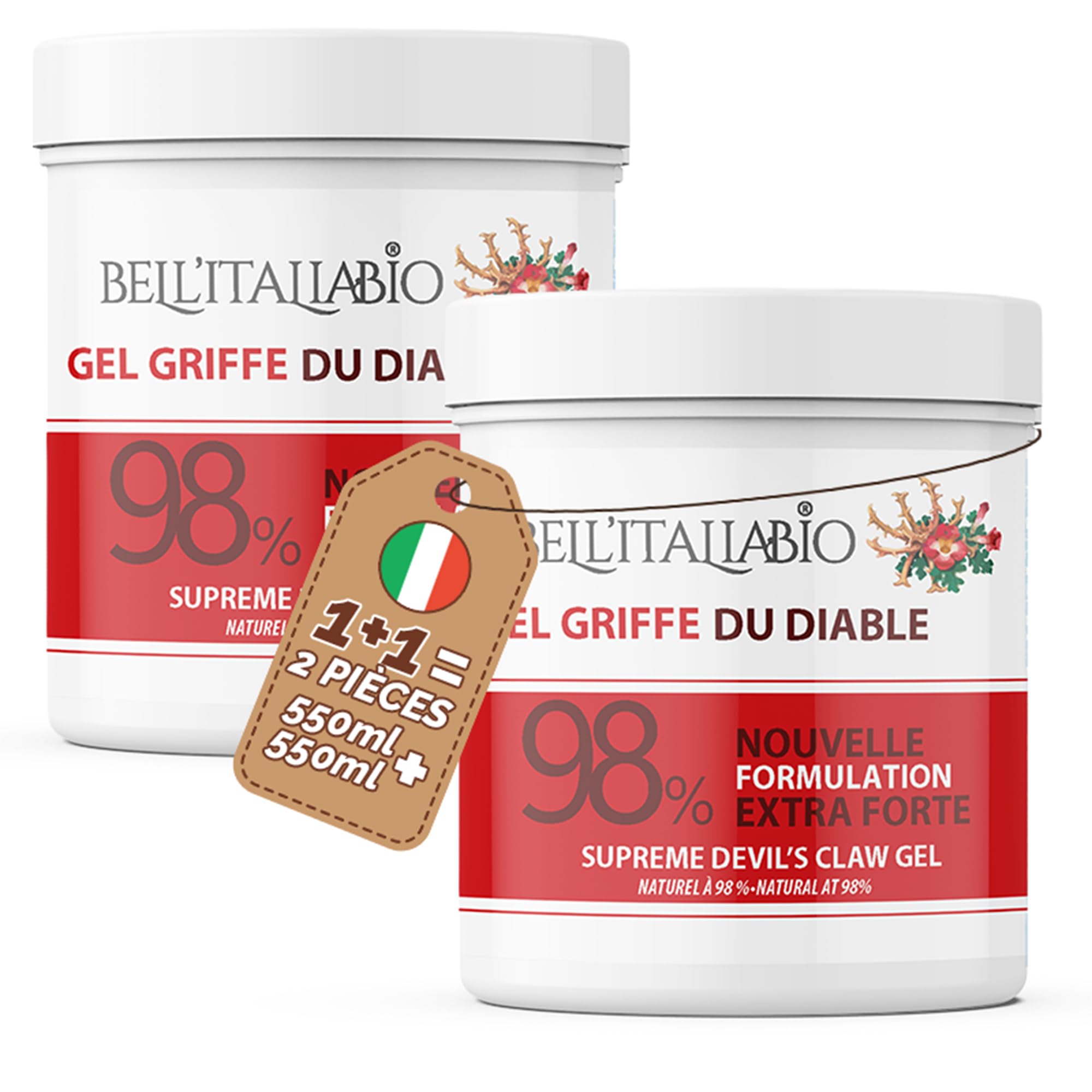 Made in Italy: BELL'ITALIABIO products are manufactured and packaged entirely in Italy, in a factory that has been producing the finest body care products for years, using natural and Italian ingredients. Natural Product - Produced by BELL'ITALIABIO, a brand known for its high-quality herbal products, Devil's Claw Strong is a 100 natural product, free of artificial or chemical ingredients. ACTIVE INGREDIENTS - Our Devil's Claw contains a rich formula, ideal for massage. This concentrated gel contains capsicum, marine collagen, and hyaluronic acid. Fast Absorption - Our Devil's Claw gel is formulated to be quickly absorbed by the skin, providing immediate relief. Thanks to its creamy consistency, the Devil's Claw Strong gel is easy to apply to the affected area. Gently massage until fully absorbed. Powerful Devil's Claw Gel - Devil's Claw is known for its beneficial properties for localized massage and wellness. This ointment contains an extra-strength formula for fast and long-lasting relief, suitable for athletes and everyone else.Fabriqué en Italie : les produits BELL'ITALIABIO sont fabriqués et conditionnés entièrement en Italie, dans une usine qui produit depuis des années les meilleurs produits pour le corps, en utilisant des ingrédients naturels et italiens. Produit Naturel - Produit par BELL'ITALIABIO, une marque connue pour ses produits à base de plantes de haute qualité, Devil's Claw Strong est un produit 100 naturel, sans ingrédients artificiels ou chimiques. INGRÉDIENTS ACTIFS - Notre griffe du diable contient une formule riche, idéale pour le massage. Ce gel concentré contient du capsicum, du collagène marin et de l'acide hyaluronique. Absorption rapide - Notre gel à la griffe du diable est formulé pour être rapidement absorbé par la peau, procurant un soulagement immédiat. Grâce à sa consistance crémeuse, le gel forte à la griffe du diable s'applique facilement sur la zone affectée. Massez doucement jusqu'à absorption complète. Gel puissant à la griffe du diable – La griffe du diable est reconnue pour ses propriétés bénéfiques pour les massages locaux et le bien-être. Cette pommade contient une formule extra-forte pour un soulagement rapide et durable, adaptée aux sportifs et à tous.Gel extra fort à 98 de griffe du diable, pommade à la griffe du diable, formule naturelle et professionnelle pour le massage musculaire et articulaire BELL'ITALIABIO 2x550 ml