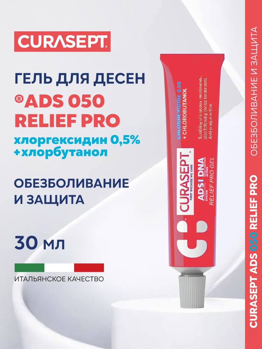Curasept ADS NEW DNA 350 RELIEF PRO 0.5% Soothing Gel for Gums, 30 ml. Recommended before and after surgical interventions and dental treatment, especially for people with a low pain threshold. Chlorobutanol soothes the mucous membrane and eliminates pain. Chlorhexidine 0.5% fights bacterial film and slows the growth of pathogenic bacteria. The updated innovative A.D.S.
