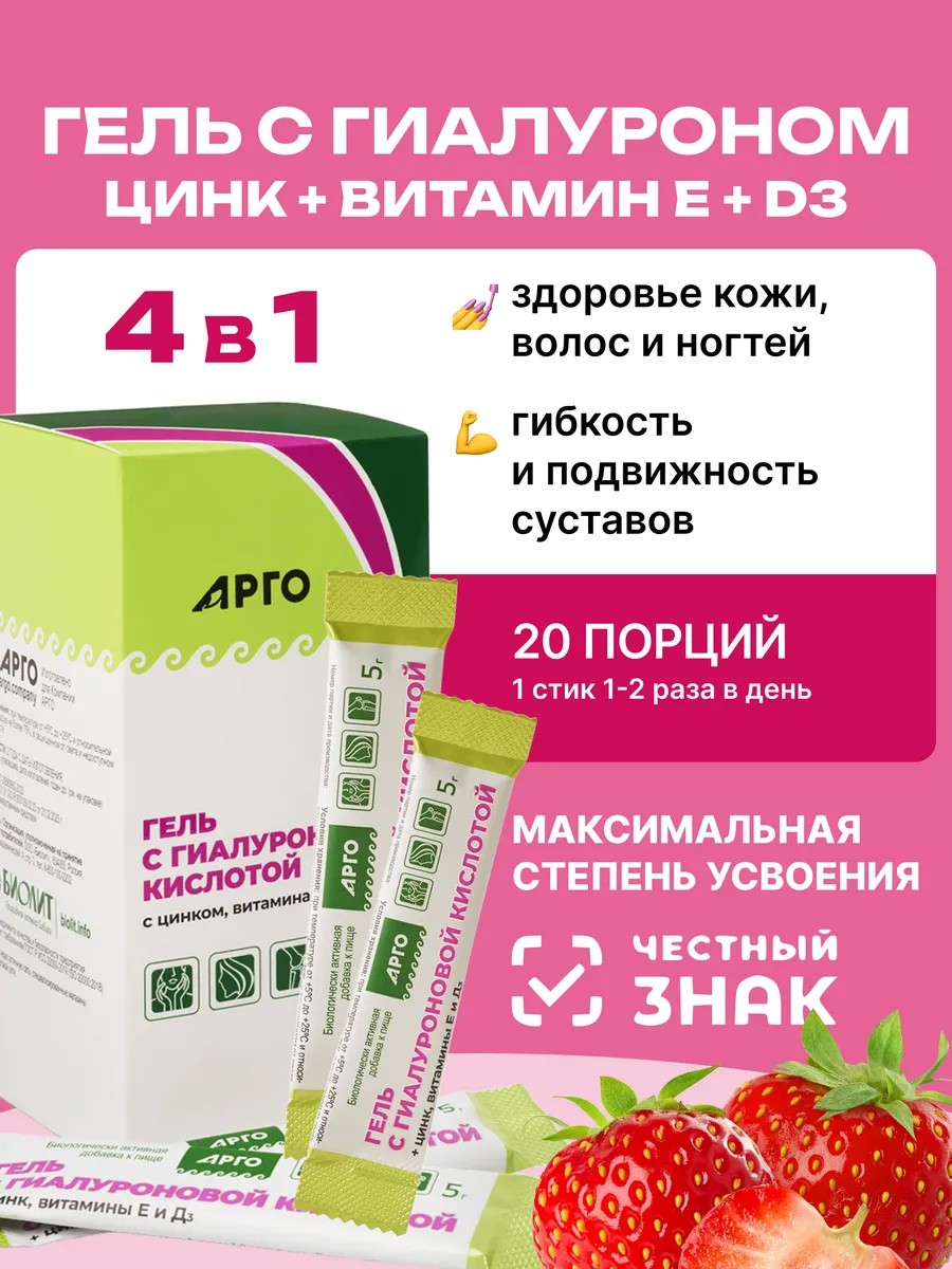 Гель с гиалуроновой кислотой, цинком, витамином Е и D3 – для молодости кожи, суставов и иммунитета, 20 стиков по 5г