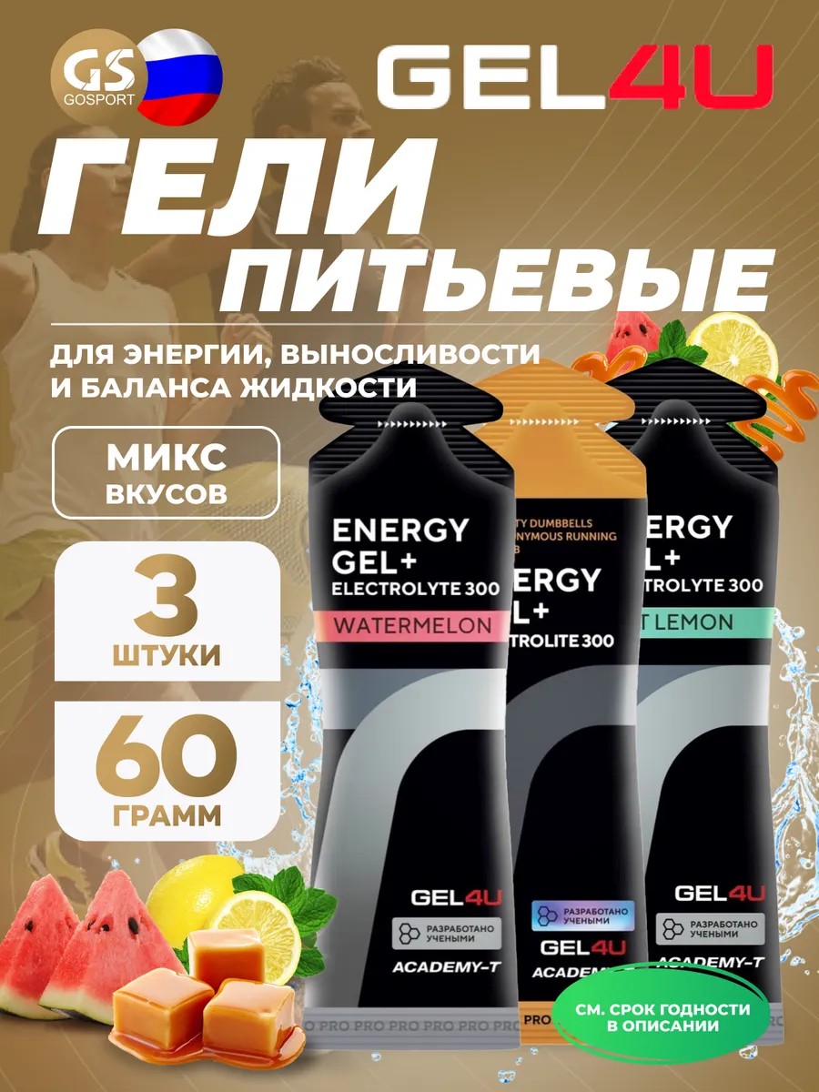 Гель питьевой Energy GEL + Electrolyte 300 3 x 60 г, Микс. Energy Gel + electrolyte 300 - энергетический гель c электролитами предназначен для обеспечения дополнительной энергией в течение интенсивных физических нагрузок, а также для восполнения потери минеральных солей при обильном потоотделении. Одна порция спортивного геля содержит 22 г углеводов и 300 мг необходимых минеральных солей. Углеводы, содержащиеся в составе энергетических гелей, пополняют запасы гликогена в организме, что обеспечивает поддержание уровня энергии, работоспособности и выносливости. Электролиты предотвращают возникновение мышечных судорог и спазмов – один из наиболее частых и неприятных симптомов, возникающих во время интенсивных тренировок. Электролиты равномерном распределяют жидкости между тканями и внутренними органами, участвуют в передаче нервных импульсов, влияют на работу мышц и нервной системы, регулируют уровень pH жидкостей тела, помогают сохранять энергию в организме. Тем самым, энергетические гели GEL4U c электролитами снабжают организм быстрой и легко усваиваемой энергией, поддерживая уровень минеральных солей. Углеводный гель GEL4U обладает текучей консистенцией и мягким вкусом без излишней приторности. Благодаря структуре близкой к изотонической, GEL4U с электролитами не требуют дополнительного приема жидкости для усвоения питательных веществ. Энергетический гель для бега и тренировок может стать полезным компонентом профессионального спортивного питания для спортсменов и людей, занимающихся спортом или фитнесом. Продукт подходит для мужчин и женщин, заботящихся о своем здоровье и красоте. Рекомендации по приему: один гель каждые 90 минут, не более 3 гелей в сутки, во время длительных нагрузок. Если вы занимаетесь в жаркую погоду, то советуем прием электролитов до, во время и после нагрузки.