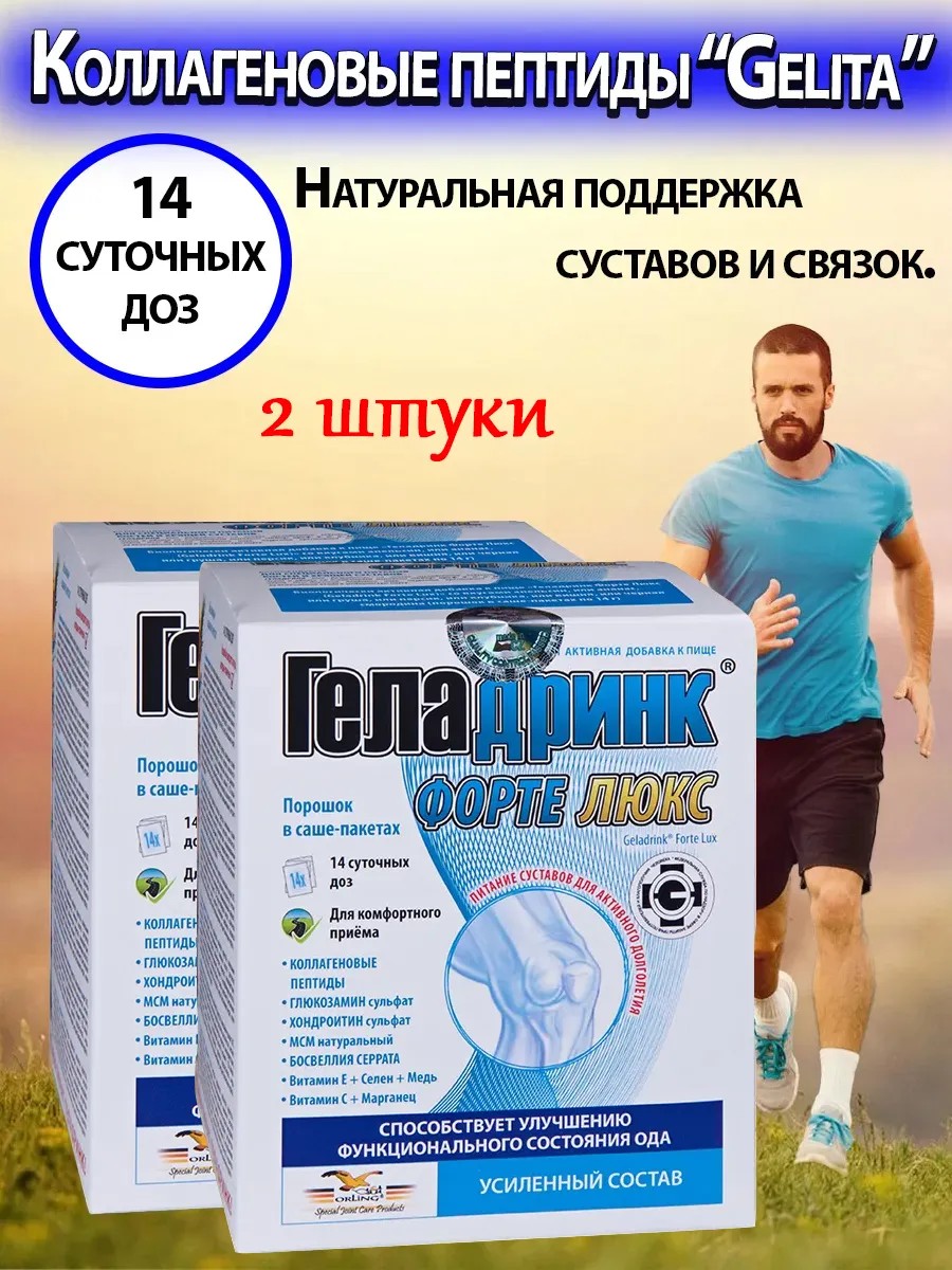 Geladrink Forte Lux is used as a preventative and comprehensive treatment for musculoskeletal disorders (osteoarthrosis, osteochondrosis, intervertebral disc herniation, tendinitis, spondylitis, spondylosis, osteoporosis, etc.).