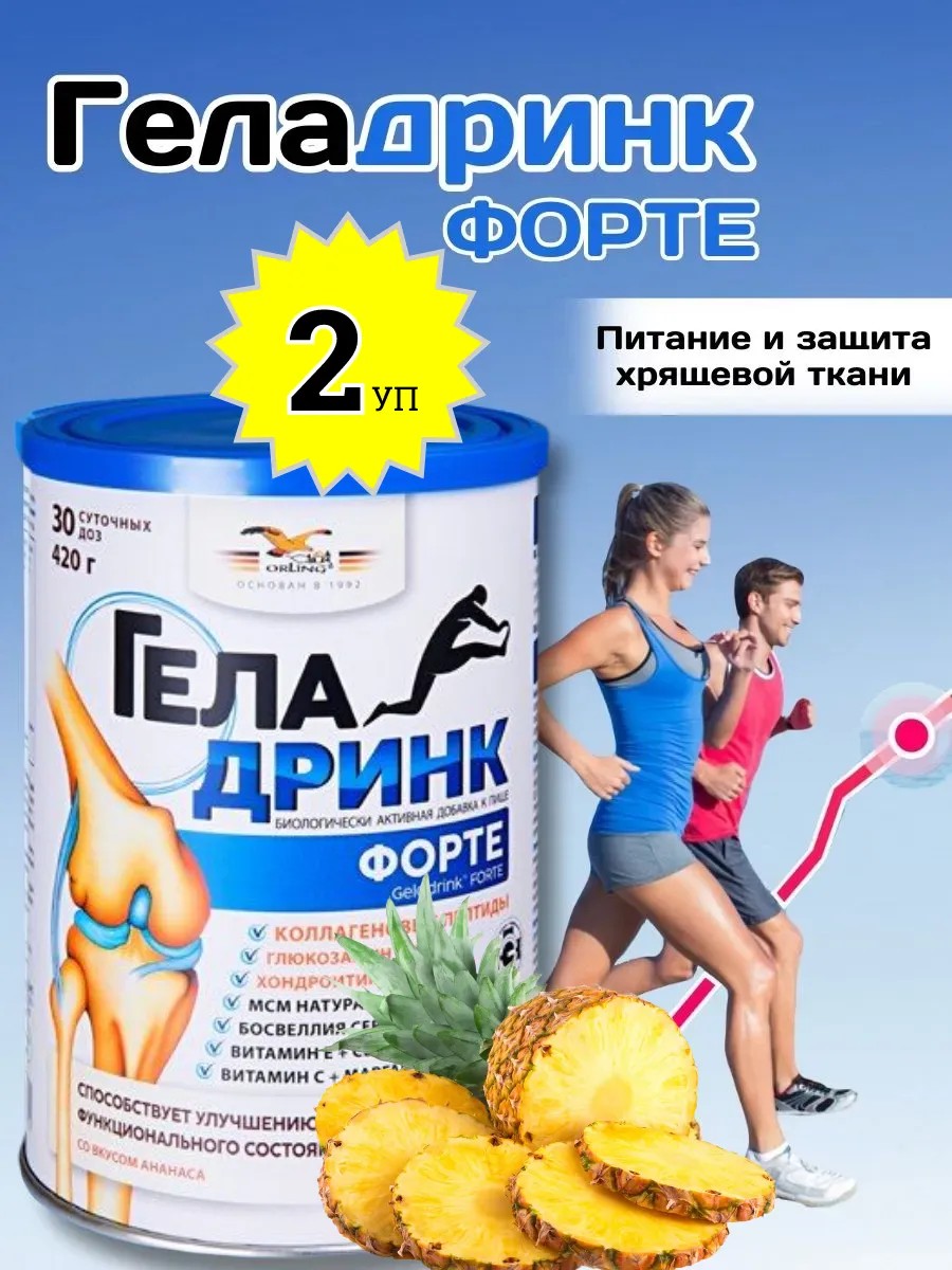 2 упаковки Геладринк Форте. Способствует улучшению функционального состояния опорно-двигательного аппарата, восстановлению нормального метаболизма хрящевой ткани, стимулирует процесс синтеза естественного коллагена, повышает антиоксидантную защиту и обеспечивает суставы и позвоночник дополнительными питательными веществами. ### Состав:Содержание в 14 граммах (дневная норма -1 мерная ложка)хондропротекторыПептидный коллагеновый гидролизат Gelita 8 000 мгГлюкозамин сульфат 1 500 мгХондроитин сульфат 800 мгМСМ натуральный 600 мгБосвеллия Серрата 100 мкгантиоксидантыВитамин С 100 мгВитамин Е 50 мгСелен 50 мкгМарганец 2мг
