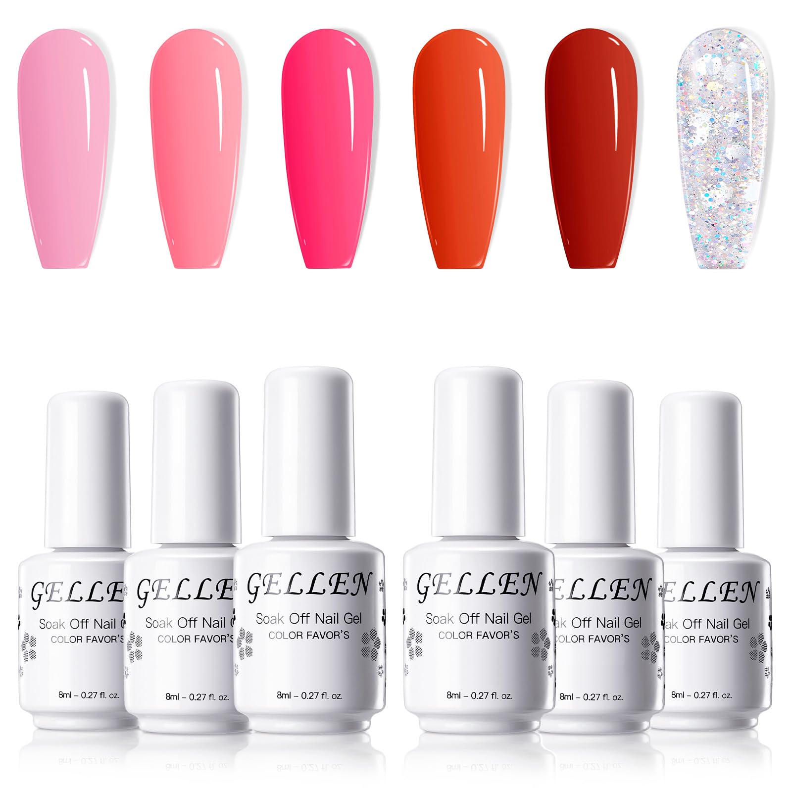 Gellen Gel Nail Polish Kit - 6 Stunning Colors Baby Pink Burgundy Rose Red Glitter Silver Gel Polish Set White Glitter Gel Polish Soak Off LED Gel Polish for Women Pageant Queen