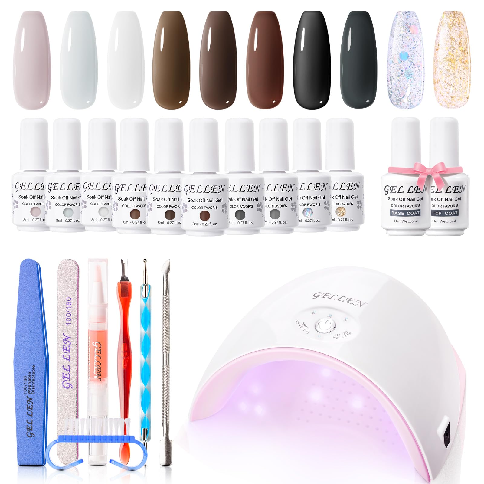 Warm Tips: May have an allergic reaction by skin contact, please read directions for use carefully and Skin Test before using is necessary. Please feel free to contact us for any issue about this kit. We are always ready to serve you. High Quality Nail Gel: With proper application, the gel nail polish will last 3 weeks+ without chipping, peeling, cracking or lifting and looks smooth and shiny; Eco-friendly products with healthy ingredients, low odor, non-toxic; Gel brushes incredibly smooth, pigmented colors as expected, wears like gel, good tenacity. 10 Trendy Color Gel: This Black White Classic Jelly Gel Color Collection can as basic gel for salon shop or home use to do nail art designs to meet your various nail art style demands. In this gel nail polish kit, you can enjoy many classic colors, which are suitable for all kinds of occasions, like workplace, party, dating, etc. 36W Powerful Nail Lamp: Innovative painless low heat, 3 modes time setting and smart sensor present you with an efficient/convenient home manicure experience. Gellen Gel Nail Polish Starter Kit: 10 well-chosen color gel polish + 36W UV/LED nail lamp + base/top coat + efficient manicure tools. The salon quality color gel and manicure tools can helps you make salon quality nails easily, great for nail art fans and nail beginners. This all-in-one gel nail polish starter kit totally is the ideal gift for women.