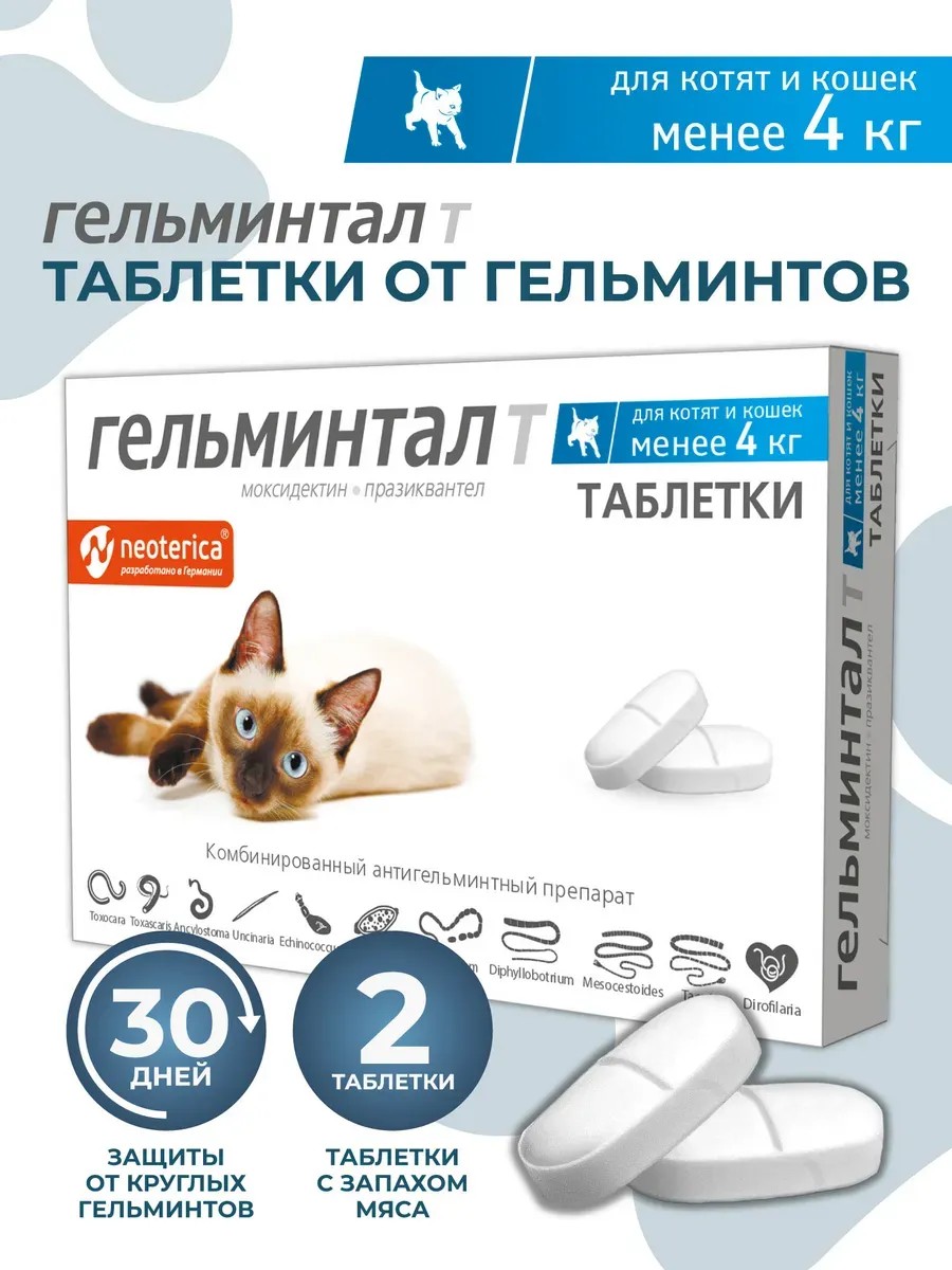 Таблетки антигельминтные для котят и кошек менее 4кг 2 таб