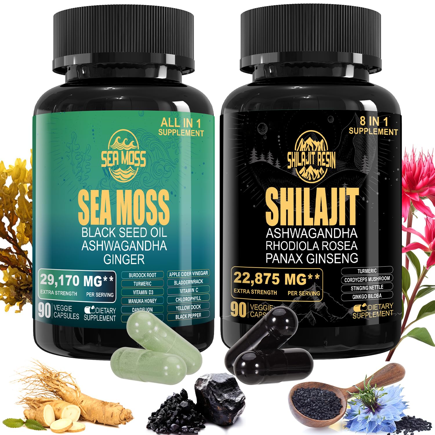 EASY TO CARRY AND EAT - Enjoy the simplicity of a two-bottle solution without compromising efficacy. conveniently packaged in individual bottles. COMPREHENSIVE NUTRITION - Our Shilajit and Sea Moss, Each in his own bottle, provide a comprehensive 8-in-1 and all-in-1 supplement, respectively. This bundle delivers a diverse range of nutrients, providing a comprehensive and convenient health solution. OUR ADVANCED OF NATURAL SHILAJIT CAPSULES - Presents the most comprehensive 8-in-1 formula, Nature's Synergy Blend featuring shilajit pure, Rhodiola Rosea, Ashwagandha,Cordyceps Mushroom and more, capsules will provide you with a perfect solution to help your energy. OUR SEA MOSS CAPSULES - Enriched with Black Seed Oil for hair health, contain a remarkable blend of 12 beneficial ingredients, including Ashwagandha, Ginger, Bladderwrack, Burdock Root and more. presents the most comprehensive all-in-1 supplement, featuring capsules. ALL-IN-ONE SOLUTION - The Shilajit Capsules, enriched with 8 potent ingredients, and Sea Moss Capsules, With over 12 essential elements. Experience the overall benefits of Black Seed Oil, Rhodiola Rosea, Ashwagandha and more in two supplement. discover the power of "all-in-one" supplements today!.