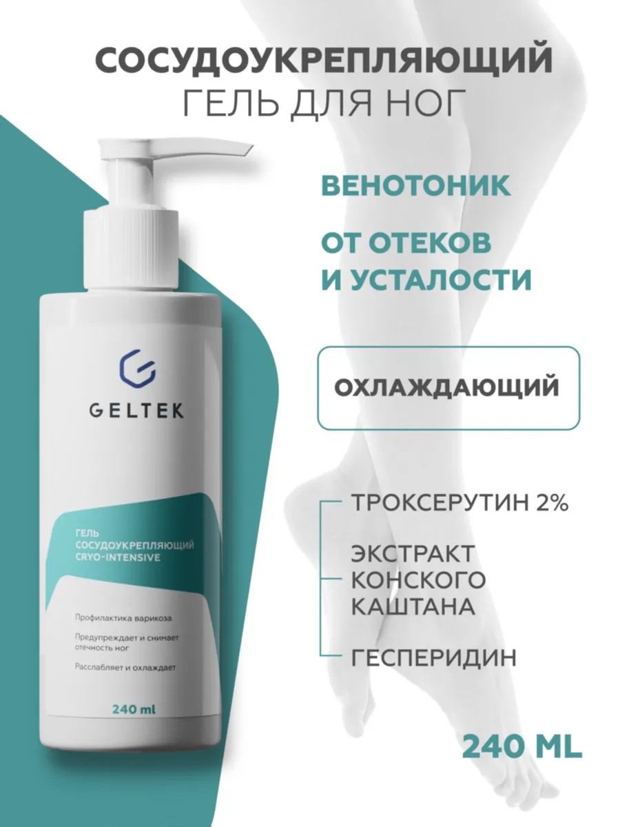 Сосудоукрепляющий гель для ног Cryo-Intensive обеспечивает уход за ногами с сосудистыми «звездочками» и «сетками». Венотоник подходит для ежедневного применения на фоне варикозного расширения вен и варикозе, хронической венозной недостаточности, при склонности к отекам и пастозности, для профилактики и борьбы с целлюлитом, при избыточном весе и эффекте “апельсиновой корки”. Рекомендуется для уставших ног при повышенных физических нагрузках, занятиях спортом, при долгом нахождении в вертикальном положении, хождении на каблуках. Можно использовать для уменьшения гематом при травмах, включая спортивные растяжки и ушибы мышц, снижает чувство боли. Троксерутин и кофеин способствует уменьшению отеков и предупреждает их появление, снижает чувство усталости и тяжести в ногах. Конский каштан и растительные экстракты в составе способствуют укреплению стенок кровеносных сосудов, снижают проницаемость и ломкость капилляров, улучшают микроциркуляцию и ускоряют лимфоток. Охлаждающий гель также оказывает антиоксидантное, успокаивающее и дезодорирующее действие. Нанесите гель на очищенную кожу утром и/или вечером, массажными движениями (снизу вверх) от ступней к бедрам, распределите до полного впитывания. При необходимости после можно нанести увлажняющий крем или мазь для ног. Не применять при нарушении целостности кожных покровов, гиперчувствительности к компонентам, при ожогах, экземе, обострении хронических дерматозов. Не допускать попадания на слизистые оболочки и в глаза. При возникновении аллергии/крапивницы смыть большим количеством воды и прекратить применение средства.