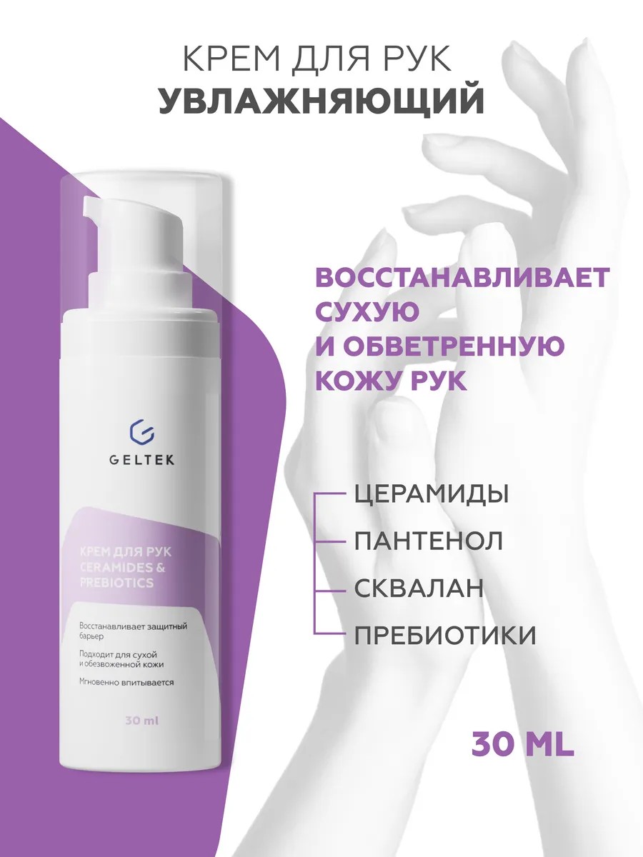 Восстанавливающий крем для рук Ceramides&Prebiotics, ногтей и кутикулы подойдет для всех типов кожи, особенно для сухой и обезвоженной, склонной к шелушению. Формула с церамидами обеспечивает питание, увлажнение, защиту, смягчение и омоложение, а также восстановление нарушенных барьерных функций эпидермиса. Легкая текстура мгновенно впитывается, не оставляет жирной пленки. Имеет приятный ненавязчивый аромат, дарит ощущение гладкости и шелковистости. Удобный дорожный мини формат с дозатором позволяет использовать средство в любой ситуации, легко помещается в сумочку, обеспечивает экономный расход.