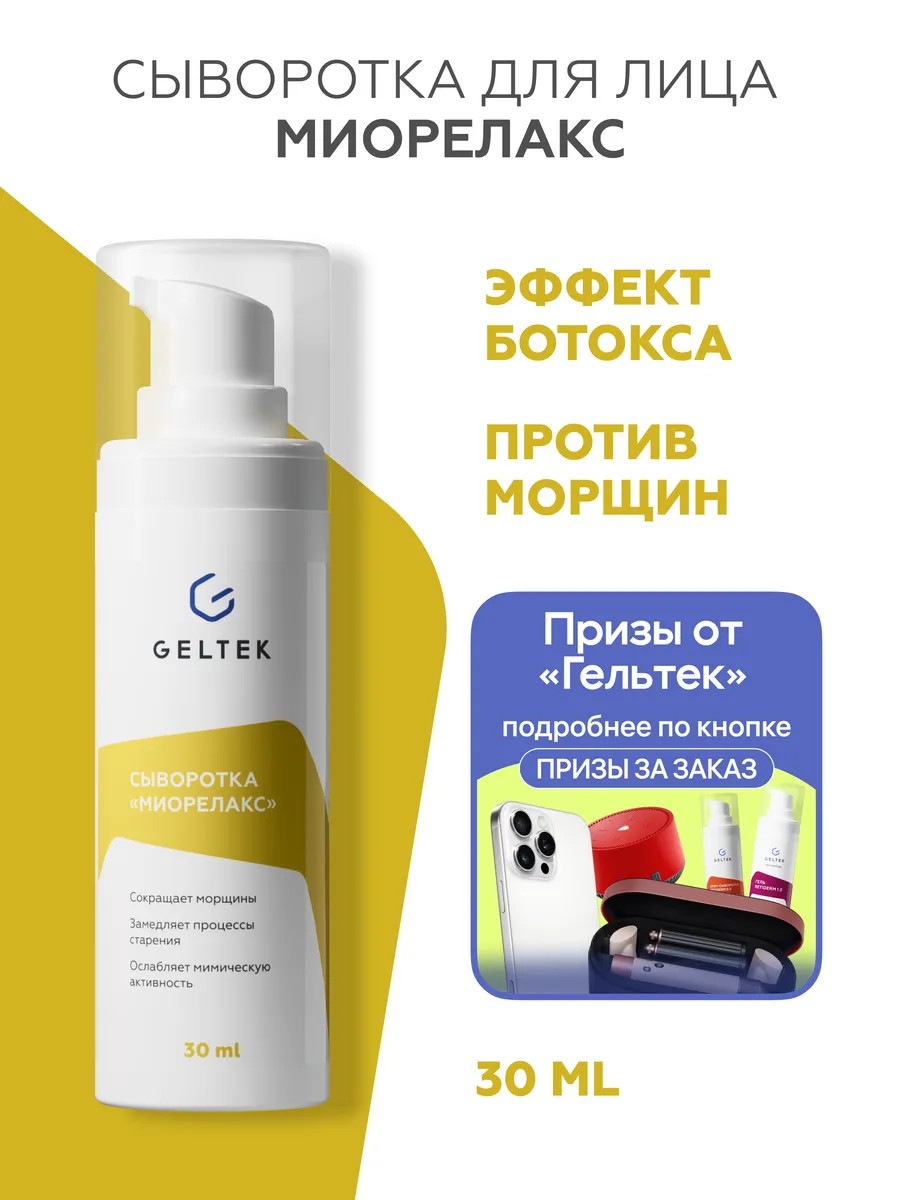Антивозрастная сыворотка для лица Geltek с эффектом ботокса предназначена для интенсивного воздействия на зоны мимической активности (на лбу, переносица, гусиные лапки вокруг глаз, кисетные морщины вокруг губ).