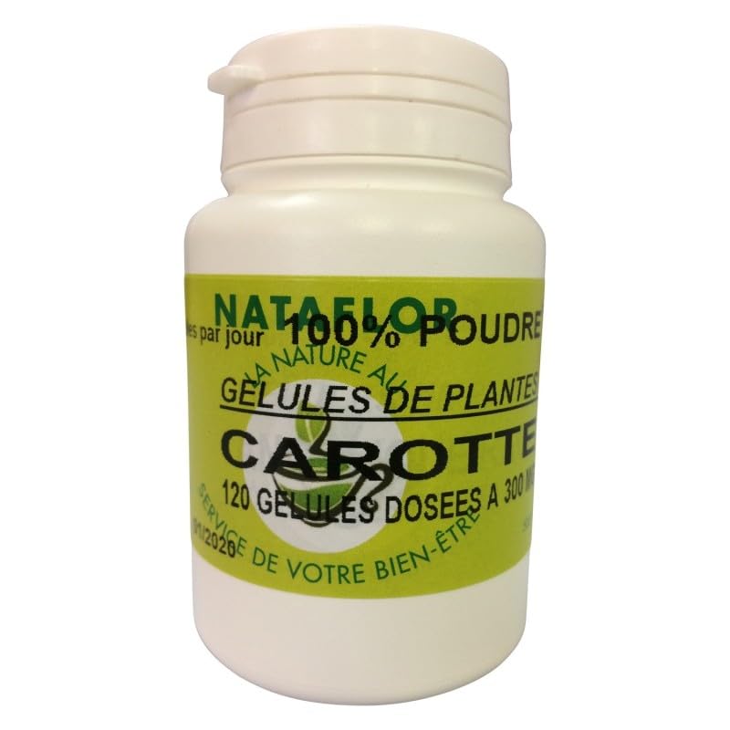 Prendre 2 gélules matin et soir. La carotte sous forme de gélules vous procurera donc un teint éclatant sous le soleil. Elle prépare à l'exposition au soleil, prévient les allergies solaires et accélère le bronzage en augmentant la production de mélanine. Le bétacarotène contenu dans la carotte est une vitamine de beauté très éfficace pour la peau.