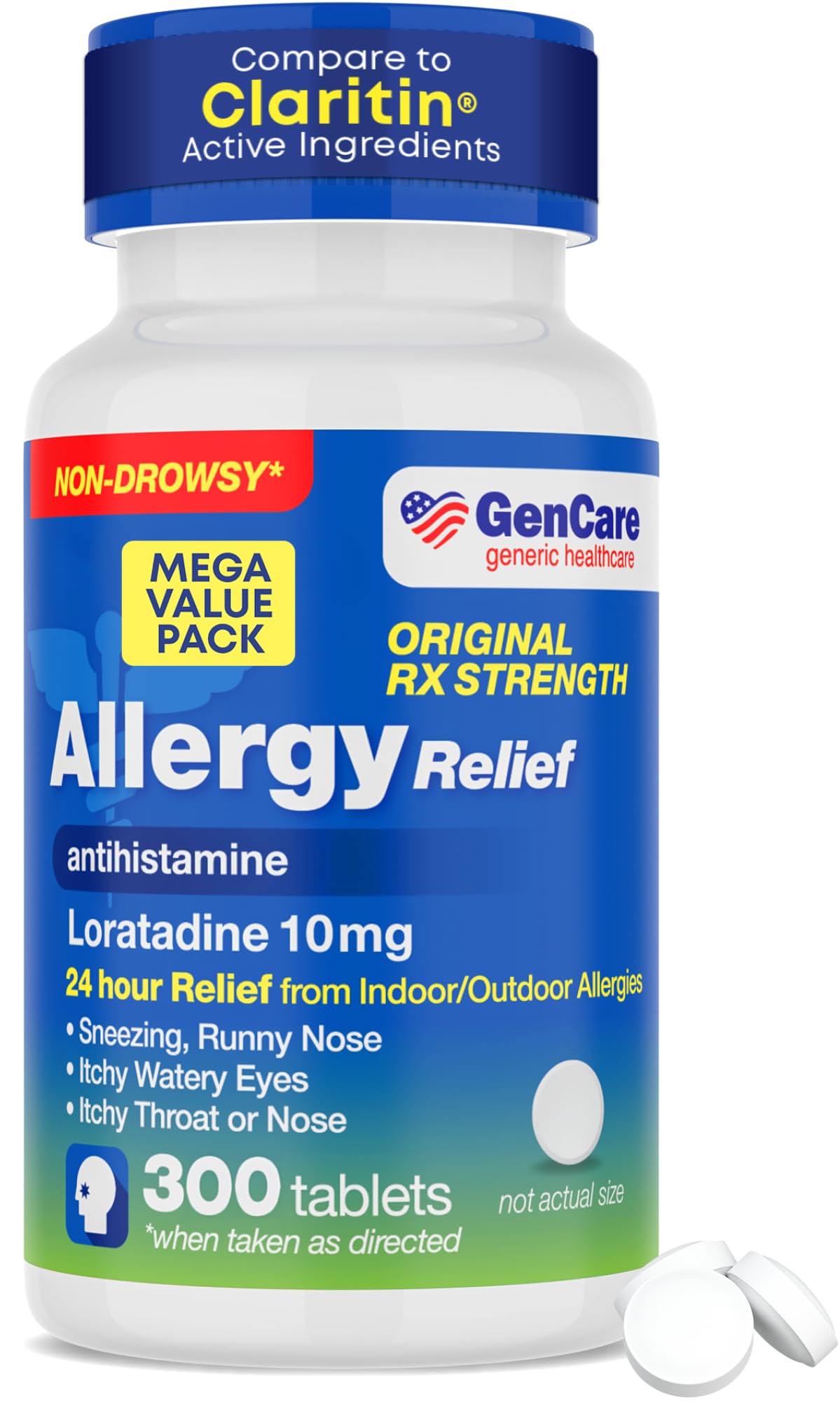 Allergies don't take days off, and neither should your relief. Whether you deal with sneezing, runny nose, itchy eyes, or other allergy symptoms – staying on top of it daily without missing a beat is key. That's where GenCare Loratadine 10mg comes in. Each person in your family—kids 6 years of age through adults—gets full 24-hour relief from just one tablet a day. No separate doses or measuring, just the same simple pill for everyone. This non-drowsy antihistamine provides 24-hour relief from indoor and outdoor allergies so you can breathe easier, stay focused, and feel like yourself again. Suitable for daily use and ideal for long-term protection. PRODUCT FEATURES: 300 Tablets Loratadine 10mg – Single Tablet Dye Free 24 Hour Relief Non Drowsy Formula Easy to Swallow For Adults Kids 6 Compare to Clariten NON-DROWSY, ALL-DAY RELIEF Loratadine blocks histamines to relieve sneezing, runny nose, itchy or watery eyes, itchy throat, and nasal congestion. It helps you breathe easier, feel more comfortable, and stay focused without making you drowsy or groggy. DAILY PROTECTION FOR YEAR-ROUND ALLERGIES From seasonal pollen to year-round triggers like dust and pet dander, GenCare Loratadine helps manage symptoms so you can go about your day without distractions. ONE TABLET FOR THE WHOLE FAMILY Each single 10 mg tablet provides the same effective dose for everyone age 6 and up. There's no need for multiple strengths or measurements. Just one easy tablet per day keeps kids, teens, and parents covered. BETTER VALUE, SAME ACTIVE INGREDIENT Why pay more for Clariten? GenCare delivers the same 10mg Loratadine in a convenient long-lasting bottle. With over 9 months of relief in one purchase, you'll save money and always be prepared.COMPARE TO CLARITEN – Get the same active ingredient as Clariten 24 Hour Non-Drowsy at a fraction of the price. GenCare Loratadine gives you trusted results with bulk savings you can count on. BULK SAVINGS – With 300 antihistamine tablets per bottle, you get months of once-a-day relief for less than name brand allergy meds. Keep your medicine cabinet stocked and skip the overpriced pharmacy with GenCare. 1 TINY TABLET FOR ADULTS KIDS 6 Loratadine 10 mg provides all-day allergy relief without the drowsiness or side effects of other antihistamines. These small tablets are easy to swallow and suitable for the whole family. Safe for children age 6 and up. NON DROWSY DYE-FREE – This allergy medication relieves allergies without making you tired or groggy. Stay focused at work or school while still getting powerful relief from pollen, dust, pet dander, and other indoor outdoor allergens. 24 HOUR ALLERGY RELIEF – Just a single tablet of this non drowsy allergy medicine helps stop sneezing, itchy eyes throat, runny nose, and other symptoms for a full 24 hours, so you don't have to keep taking allergy pills all day long.