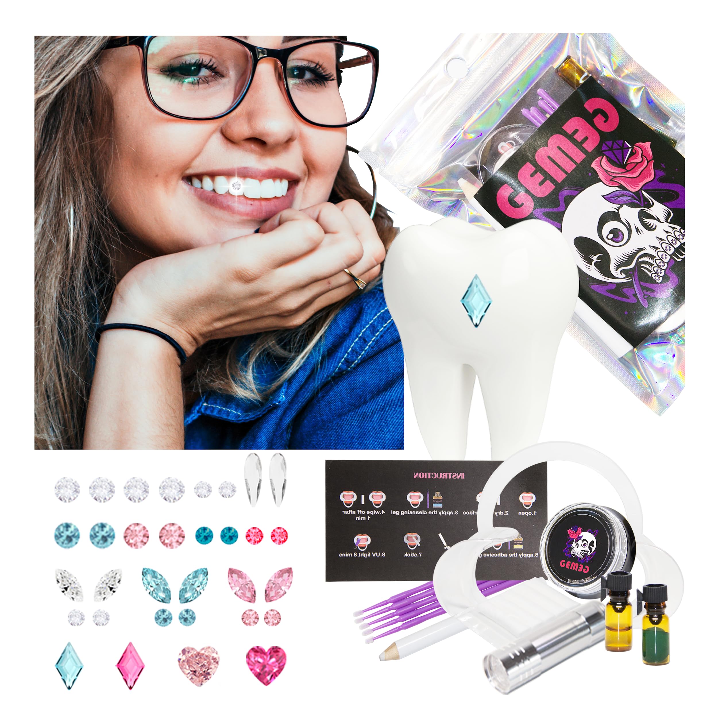 Enjoy the tartar trip at home: super easy and fun.Instructions and aftercare are included in the package to guide you through this funny 5-minute DIY toothed trip.Follow the instructions and make sure that it lasts up to 4 weeks or even longer.?UPGRADING Application Tools? The tips of a long -lasting Gem Smile are a dry tooth surface and a strong hardening light.1. We offer improved powerful light for a continuous binding in just 2 minutes, and stronger glue with larger capacity ensures a long-lasting gemstone smile.Original two -stage tightening solution: clean and binding.1. Clean first to thoroughly clean dirt from the tooth surface.2. Bond after use the strong hardening light to fully harden the glue.Glamorous Gems Smile: We offer different shapes and colors for tinkering and playing with different styles.Including 32 pink/blue/crystal stones with heart/diamond form/marquise/round S/round L-styles.?Full tooth-edelstein kit? Everything in a set.The entire package contains 1 cheek roller, 5 microba door applicators, 5 cotton rolls, cleaning and adhesive materials, 1 gem-picker, 32 gemstones (pink, blue, white), 1 light, instructions and aftercare.Genießen Sie die Zahnstein-Reise zu Hause: super einfach und macht Spaß. Anleitung und Nachsorge sind im Paket enthalten, um Sie durch diese lustige 5-minütige DIY-Zahnedelreise zu führen. Folgen Sie den Anweisungen und achten Sie darauf, es hält bis zu 4 Wochen oder sogar länger. ?Upgrading Application Tools? Die Spitzen eines langanhaltenden Gem Smile sind eine trockene Zahnoberfläche und ein starkes Aushärtungslicht. 1. Wir bieten verbessertes leistungsstarkes Licht für eine durchgehende Bindung in nur 2 Minuten, und stärkerer Kleber mit größerer Kapazität sorgt für ein langanhaltendes Edelstein-Lächeln. Original Zweistufige Straffungslösung: Sauber und Bindung. 1. Reinigen Sie zuerst, um schwer zu entfernenden Schmutz von der Zahnoberfläche gründlich zu reinigen. 2. Bond After Verwenden Sie das starke Aushärtungslicht, um den Kleber vollständig auszuhärten. Glamouröses Gems Smile: Wir bieten verschiedene Formen und Farben zum Basteln und Spielen mit verschiedenen Stilen. Einschließlich 32 rosa/blau/kristallsteine mit Herz/Diamantform/Marquise/runden S/runden L-Stilen. ?Vollzahn-Edelstein-Kit? Alles in einem Set. Das gesamte Paket enthält 1 Wangenaufroller, 5 Mikrobürstenapplikatoren, 5 Baumwollrollen, Reinigungs- und Haftmaterialien, 1 Edelstein-Picker, 32 Edelsteine (rosa, blau, weiß), 1 Licht, Anleitung und Nachsorge.