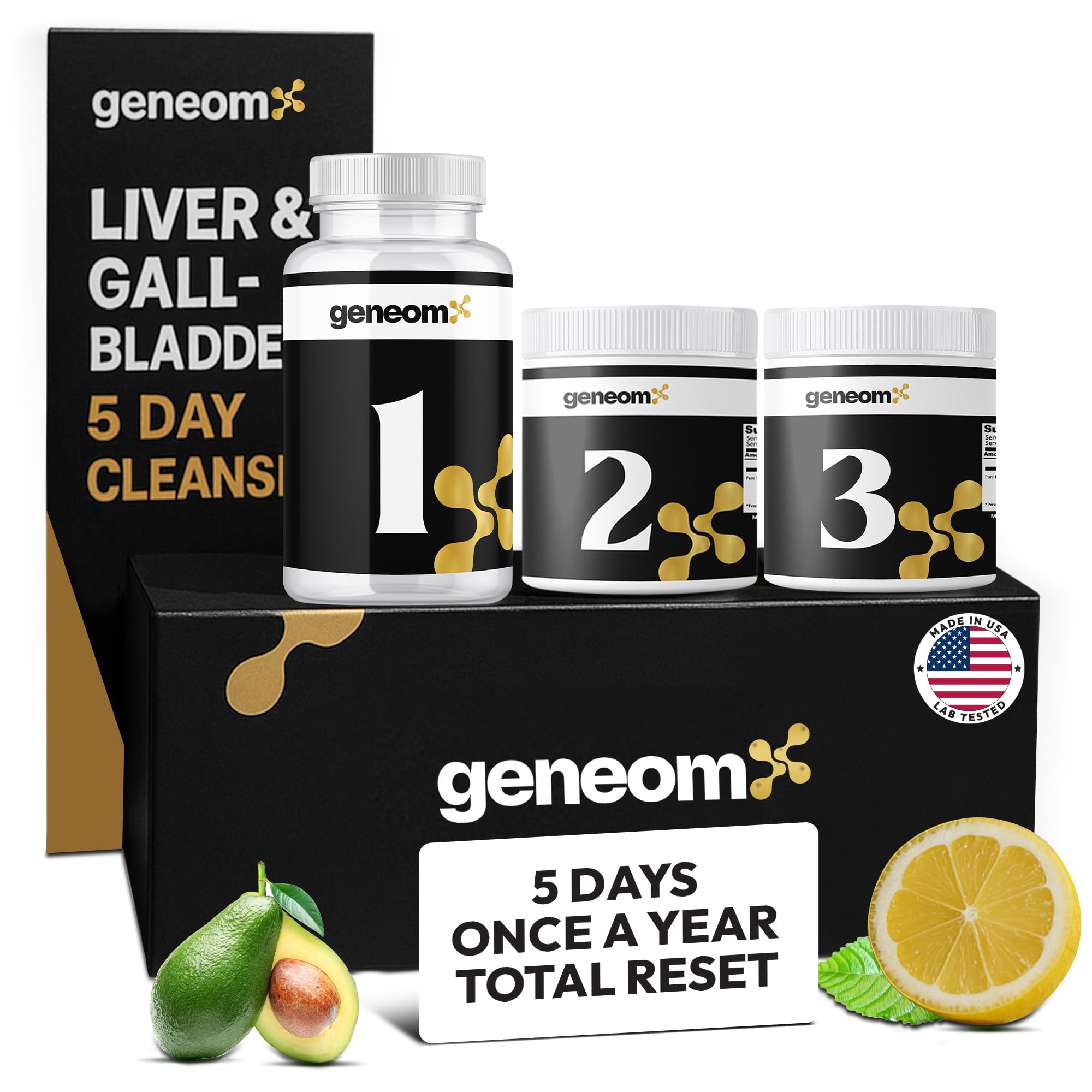 : GeneomX Liver and Gallbladder Whole Body Detox is proudly made in the USA in a GMP-certified facility, available in both capsule and powder form. Each batch of fatty liver cleanse detox repair is third-party lab tested to ensure purity, safety, and potency—delivering trusted quality for your liver complex and gallbladder health. , : GeneomX is a 5-day gallbladder, liver detox and cleanse program that's gluten-free, non-GMO, and free from artificial additives—making it safe for cleansing with lasting benefits. This effective formula helps flush out toxins, improve bile flow, and reduce the risk of fatty liver disease, gallstones, and sluggish digestion. It also promotes metabolic health, enhances nutrient absorption, and supports immune function. : Our liver gallbladder supplements cleansing formula is designed to relieve bloating, indigestion, and discomfort by boosting bile secretion and digestive function. This active liver detox supplement helps dissolve bile sludge to prevent gallstones and promote smooth digestion. The Genomx liver gallbladder cleanse also supports energy, mental clarity, and metabolism by reducing toxin buildup. - : Formulated with Malic Acid, Magnesium Citrate, Magnesium Sulphate, and Lemon Juice Powder to promote liver repair and give gallbladder support, our liver detox cleanse support digestion, and improves waste elimination. This gall bladder cleanse detox repair cleanse kit encourages healthy bile production for effective fat breakdown, while Vitamin C and Avocado Oil Powder enhance overall detox and digestive comfort. - : GeneomX features 1 bottle of capsules (Days 1–4) and 2 powder blends (Evening Morning of Day 5) to support a full liver and gallbladder detox. Each step is labeled and guided by a clear schedule in the manual, helping gently flush toxins, boost bile flow, and support digestion with natural mineral salts. Promotes internal balance, reduces toxic buildup, and supports long-term organ vitality and overall digestive wellness.