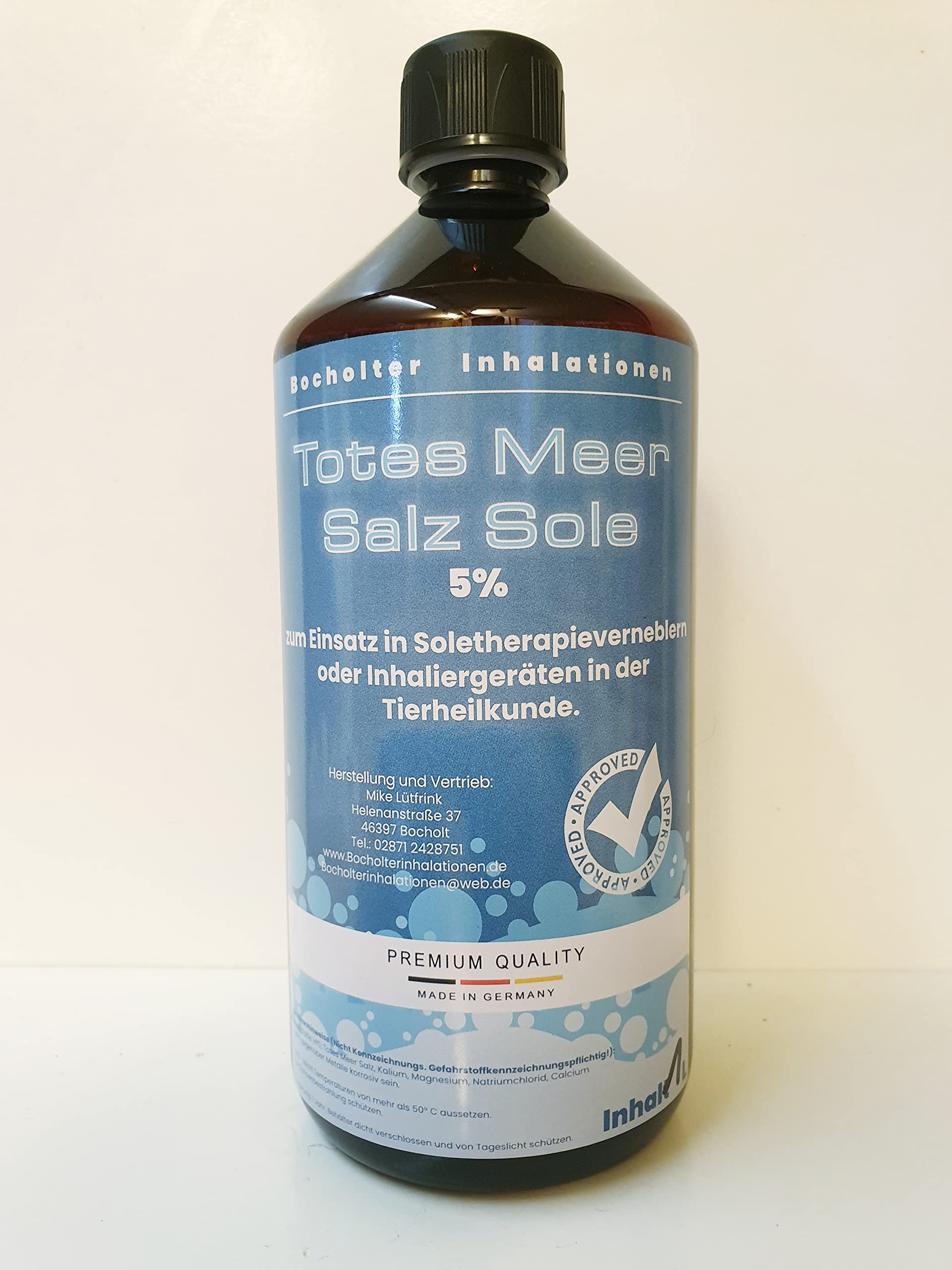 Totes Meer Sole zur Pferdeinhalation. 5 ige TotesMeerSalzsole Soletherapie einsetzbar in Ihre Solevernebler oder Inhaliergeräte. EXPRESSVERSAND: BEI ZAHLUNGSEINGANG BIS 18:00 GEHT DIE WARE NOCH AM GLEICHEN WERKTAG ZU DHL.