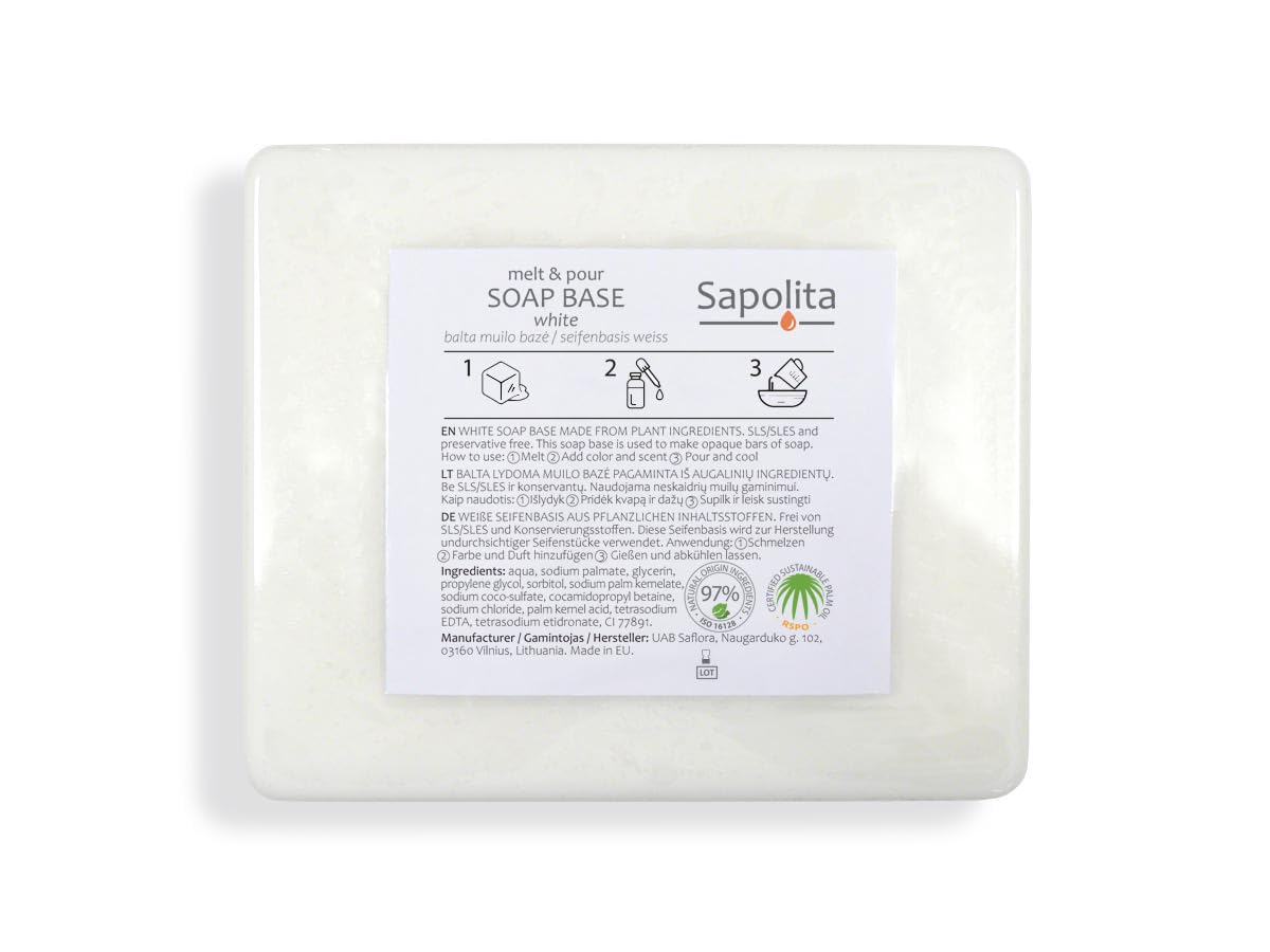 Vegetable oil-based soap base, SLS SLES free. This soap base is used to make white soap bars. INGREDIENTS Aqua, Glycerin, Sodium Palmate, Sodium Palm Kernel Oil, Propylene Glycol, Sorbitol, Sodium Coco Sulfate, Cocamidopropyl Betaine, Stearic Acid, CI 77891. SAFETY WARNING H290: May be corrosive to metals See more