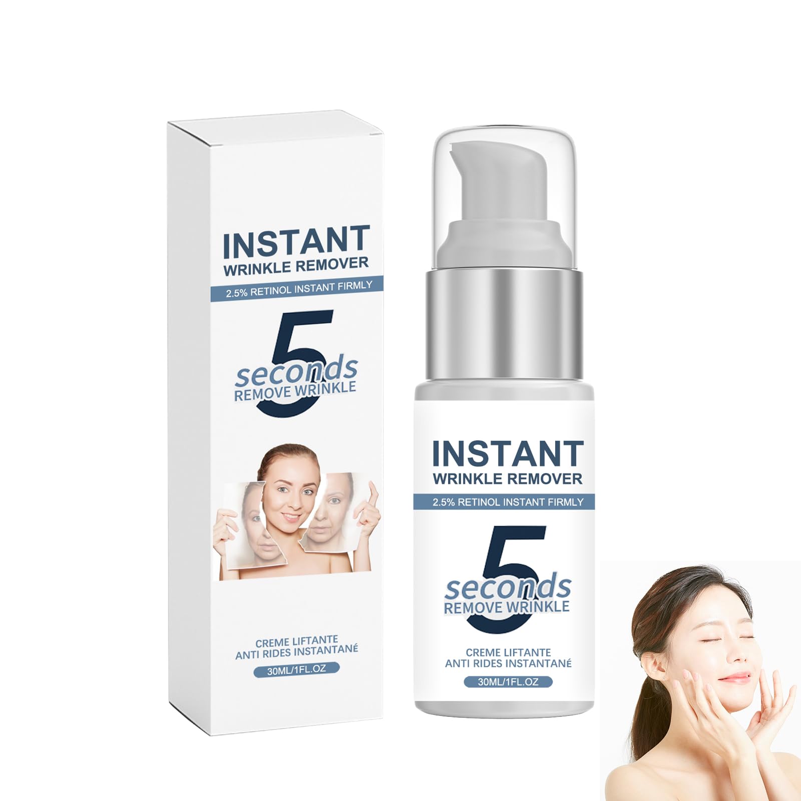 : The 5 Second Lifting Firming Anti-Aging Cream is your quick solution for visibly smoother, firmer, and more radiant skin. The highly effective instant lifting formula provides a noticeable firming effect in seconds and visually diminishes wrinkles, crow's feet, and fine lines. At the same time, the moisturizing treatment works against under-eye bags, dark circles, and puffiness – ideal for starting the day or as a quick beauty boost. The lightweight cream absorbs quickly without leaving a greasy residue and provides a perfect smooth finish under makeup. Suitable for all skin types, especially for those seeking an immediately visible anti-aging effect. Perfect for the face, eye area, and other demanding skin areas. Anti-Wrinkle Cream 30 ml Warnings: NO SAFETY WARNING NOSuitable for all skin types: This face cream is suitable for all skin types and can be used daily to nourish and protect the skin. Gentle and effective for the sensitive eye area, yet strong enough for the face, forehead, and nasolabial folds. Suitable for all skin types. Natural ingredients: The cream absorbs quickly, is non-sticky, and leaves the skin smooth and even. Perfect as a base under makeup or for daily skincare. Its moisturizing and repairing properties are suitable for all skin types. In autumn and winter, when the weather is dry, the skin can be effectively moisturized. Moisturizing and hydrating: Enriched with nourishing ingredients, the cream intensely hydrates, improves skin elasticity, and helps reduce the formation of new wrinkles. Effectively replenishes lost moisture, improves dry, rough, and dull skin, retains moisture, and hydrates the skin for a long time. It can be used year-round. Safe and effective: It is composed of natural organic ingredients, brightens the complexion, smooths wrinkles, rejuvenates the skin, nourishes the skin, eliminates blemishes, and combats skin aging. Anti-aging: Collagen improves the appearance of fine lines and wrinkles for a more youthful look. The innovative lifting formula smooths fine lines, visibly firms the skin, and ensures a fresher, younger appearance in seconds.Crème anti-âge lifting Firming de 5 secondes, effet immédiat, anti-poches et lifting des yeux, soin hydratant raffermissant pour le visage et les yeux, raffermissant le visage et les yeux, 1DESCRIPTION DU PRODUIT DESCRIPTION DU PRODUIT Description du produit : La crème anti-âge Lifting Firming de 5 secondes est votre solution rapide pour une peau visiblement plus lisse, plus ferme et plus radieuse. La formule de lifting instantané très efficace assure un effet raffermissant notable en quelques secondes et fait disparaître visuellement les rides, les pattes d'oie et les ridules. En même temps, le soin hydratant agit contre les poches sous les yeux, les cernes et les gonflements – idéal pour commencer la journée ou comme aide rapide à la beauté. La crème légère pénètre rapidement sans graisser et donne une finition lisse parfaite sous le maquillage. Convient à tous les types de peau, en particulier pour les personnes à la recherche d'un effet anti-âge immédiatement visible. Parfait pour le visage, le contour des yeux et les zones de peau exigeantes. Crème anti-rides 30 ml Avertissements : NO AVERTISSEMENT DE SÉCURITÉ NOConvient à tous les types de peau : cette crème pour le visage convient à tous les types de peau et peut être utilisée quotidiennement pour nourrir et protéger la peau. Doux et efficace pour la zone sensible des yeux, tout en étant assez fort pour le visage, le front et les rides nasogéniennes. Convient à tous les types de peaux. Ingrédients naturels : la crème pénètre rapidement, ne colle pas et laisse la peau lisse et uniforme. Parfait comme base sous le maquillage ou pour les soins quotidiens. Ses propriétés hydratantes et réparatrices conviennent à tous les types de peau. En automne et en hiver, lorsque le temps est sec, la peau peut efficacement. Hydratante et hydratante : enrichie en ingrédients nourrissants, la crème hydrate intensément, améliore l'élasticité de la peau et aide à réduire la formation de nouvelles rides. Reconstitue efficacement l'humidité perdue, améliore la peau sèche, rugueuse et terne, peut retenir l'humidité et hydrater la peau pendant longtemps, peut être utilisé toute l'année. Sûr et efficace : il est composé d'ingrédients organiques naturels, éclaircit le teint, lisse les rides, rajeunit la peau, nourrit la peau, élimine les taches et agit contre le vieillissement de la peau. Anti-âge : le collagène améliore l'apparence des ridules et des rides pour obtenir un aspect plus jeune. La formule lifting innovante lisse les ridules, raffermit visiblement la peau et assure une apparence plus fraîche et plus jeune en quelques secondes.