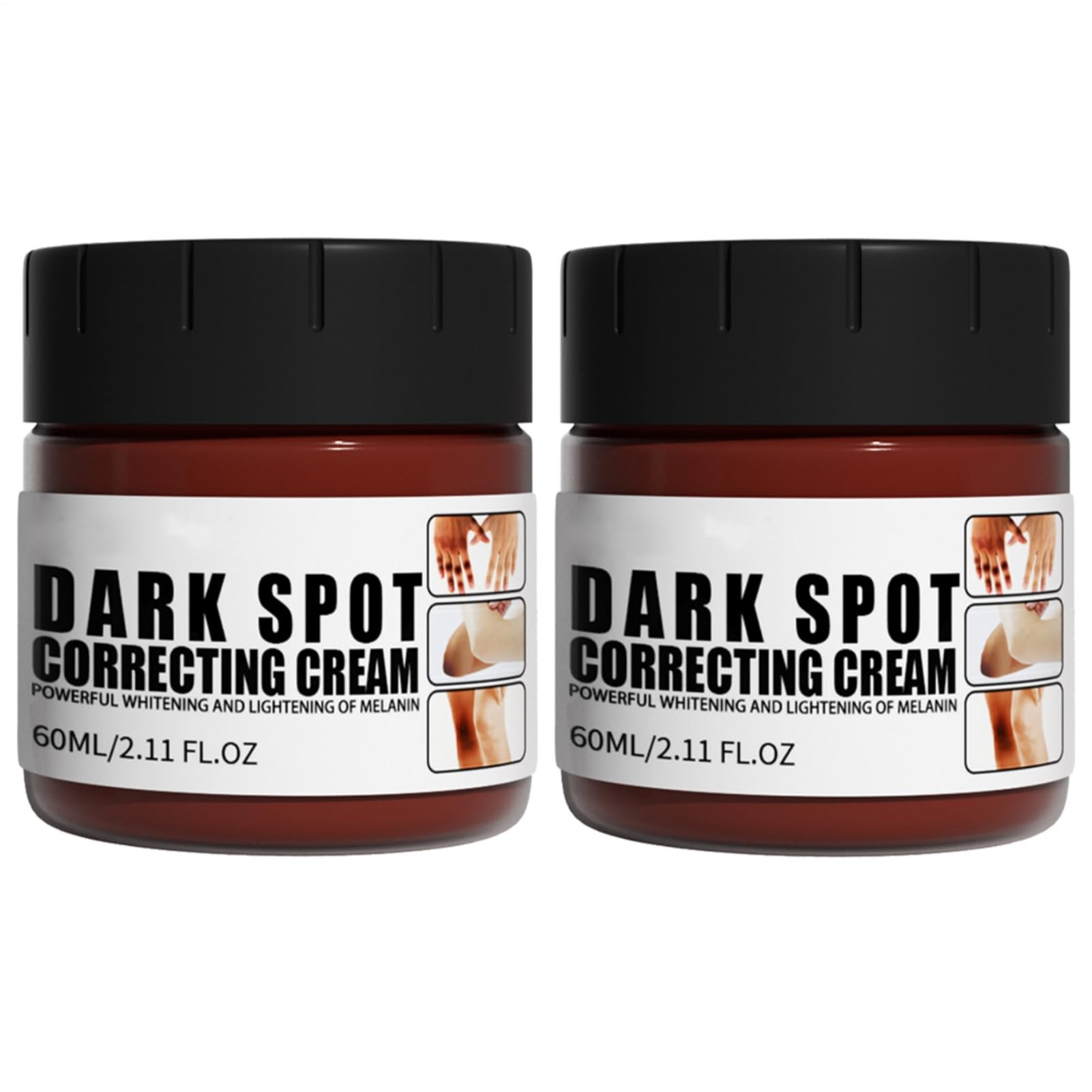 Le texte se lit comme suit : « CRÈME CORRECTRICE DES TACHES BRUNES ». Images du produit montrant un pot de crème brun foncé, le produit appliqué avec les mains et des panneaux de démonstration avant/après le traitement de la peau.