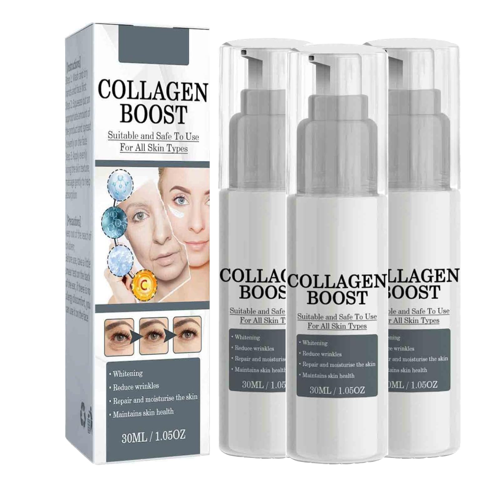 Product Features: Name: Collagen Boost Anti-Aging Serum Net Contents: 30 ml Shelf Life: 3 years Target Audience: Adults Package Contents: 1 2 3 x Collagen Boost Anti-Aging Serum Directions for Use: First, cleanse and dry your face. Then, apply an appropriate amount of product to your face and gently massage into the skin for 3 to 5 minutes until fully absorbed. SAFETY WARNING No