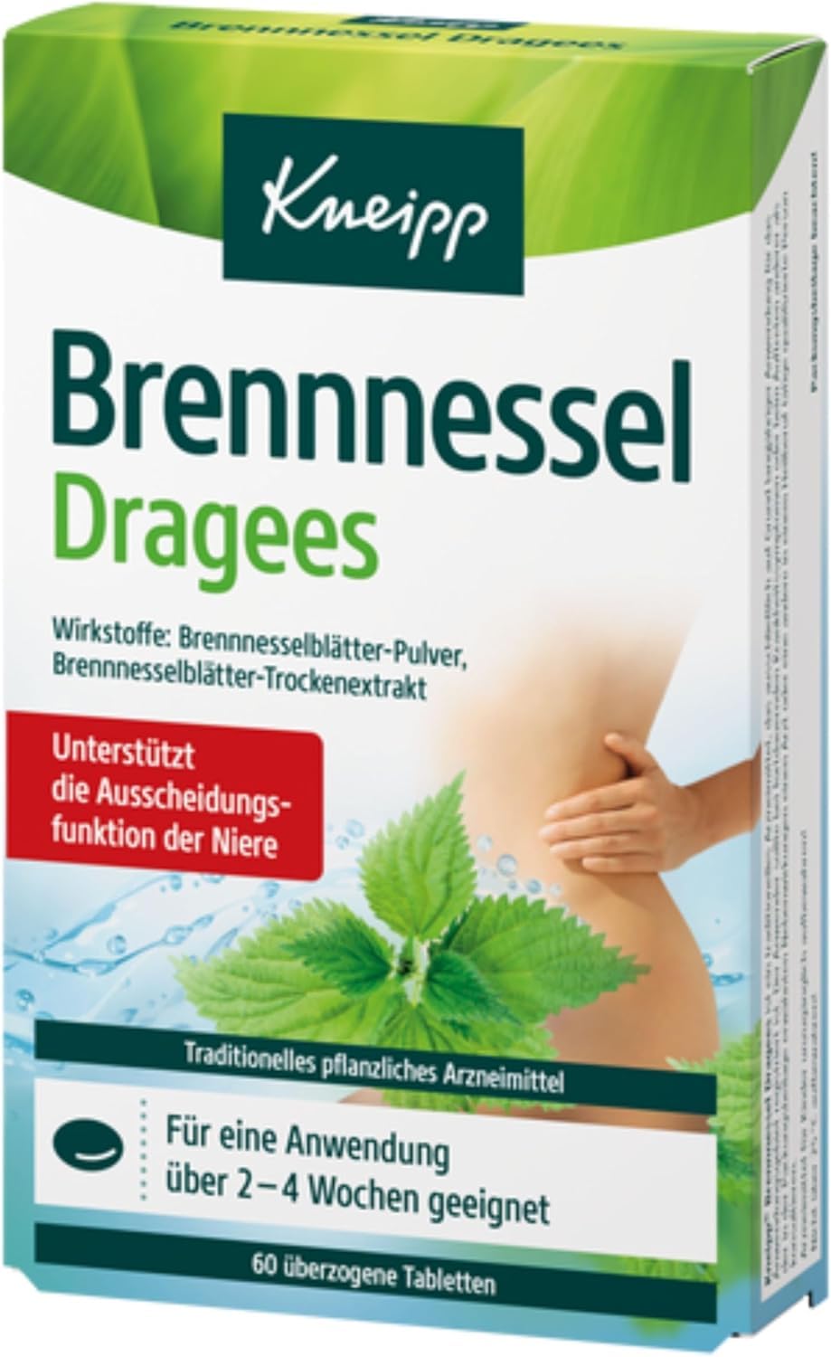 : Kneipp Nettle Dragees - 60 pieces. Discover the power of nature with Kneipp Nettle Dragees! These high-quality coated nettle tablets are not only a traditional herbal remedy but also a valuable support for your health. Each tablet contains 35 mg of dry extract and 185 mg of the finest nettle leaf powder, rich in valuable nutrients. Nettle (Urtica dioica) has been known for centuries for its versatile healing properties and is valued in traditional herbal medicine. Kneipp Nettle Dragees contribute to the normal function of the kidneys, one of the most important excretory organs in the human body. Healthy kidney function is essential for overall well-being and detoxification. These dragees are specially formulated for adults and are ideal for use over a period of two to four weeks. They are easy to take and therefore fit perfectly into your daily routine. Whether in a hectic professional life or at home, Kneipp Nettle Lozenges are always a convenient addition to your daily health routine. The coated form not only ensures a pleasant swallow but also protects the valuable ingredients from external influences. With them, you can be sure you're getting the best of nature. Kneipp stands for quality and tradition – trust a product based on decades of experience in herbal medicine. Treat yourself and support your kidneys with Kneipp Nettle Lozenges. Ideal for anyone who appreciates natural remedies and wants to actively promote their health. Let yourself be convinced by the effectiveness of these traditional remedies and discover the soothing feeling of balanced bodily function. Product Details: Product Name: Kneipp Nettle Lozenges Contents: 60 pieces Active Ingredients: 35 mg dry extract, 185 mg nettle leaf powder Application: Suitable for adults, recommended for a period of two to four weeks Trust in the power of nature – choose Kneipp Nettle Lozenges for your well-being!