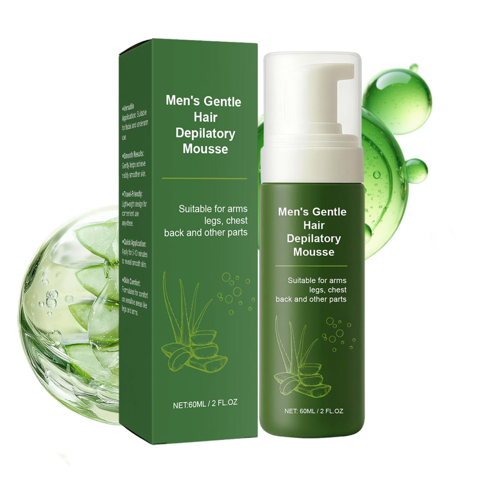 Achieve effortless smooth skin with this men's hair removal cream specially formulated to meet men's needs. The 60ml formula effectively removes unwanted hair from areas such as cheeks, underarms, arms, legs, thighs, and even sensitive areas like the genitals. Unlike traditional shaving methods, this hair removal cream offers a painless and skin-friendly solution. Ideal for facial hair removal or body care, it's suitable for fathers and men of all ages who value convenience and comfort. Use it with confidence as it's designed for daily grooming routines and won't cause irritation. Perfect for a clean and polished look after every use. Features: Name: Men's Hair Removal Cream Capacity: 60ml Note: Due to differences in monitor and lighting, the item's color may be slightly different from the picture. Measurements are taken by hand, so the sizes indicated may vary by 1 to 2 cm. Product list: 1 men's hair removal cream SAFETY WARNING Not applicableFast Hair Softening: This hair removal cream softens unwanted hair with its fast-acting formula and guarantees rinsing in 58 minutes, leaving skin smooth and clean. Ideal for maintaining a well-groomed appearance on stressful mornings, it promotes an effortless routine to start the day with immediately noticeable results. Enriched with Natural Extracts: Formulated with plant-based moisturizing properties, this men's hair removal cream effectively absorbs moisture to prevent dryness and irritation, and offers a soothing effect that increases comfort during and after hair removal. The natural extracts support skin elasticity, provide long-lasting hydration for a fresh feeling, and contribute to gentle hair removal, making it ideal for sensitive skin. Irritation-Free Care: This men's hair removal cream ensures gentle treatment for sensitive skin, effectively eliminating discomfort and blemishes, and promoting skin hydration and softness. With each application in your grooming routine, it boosts confidence thanks to reliable, irritation-free results for a pleasant daily experience. Easy full-body care: Designed as a one-stop solution for complete hair removal, this men's grooming product works effectively on the chest, back, and face. The adaptive multi-zone functionality simplifies daily routines and ensures everyday convenience by delivering reliable performance when removing hair from different areas. Hassle-free daily routine: Thanks to its easy-to-use foam spray application, this men's hair removal cream guarantees a consistent and effective grooming experience. It saves valuable time and effort in your schedule, especially when getting ready for work or leisure activities. The simple use of the spray foam allows for reliable hair removal that can be seamlessly integrated into a busy daily life, for consistently smooth results.Crème dépilatoire naturelle pour homme - 60 ml - Pour joues, aisselles, bras, jambes, cuisses, visage, bikiniDESCRIPTION DU PRODUIT DESCRIPTION DU PRODUIT Obtenez une peau lisse sans effort avec cette crème dépilatoire pour homme spécialement conçue pour répondre aux besoins des hommes. La formule dépilation de 60 ml élimine efficacement les poils indésirables des zones telles que les joues, les aisselles, les bras, les jambes, les cuisses et même les zones sensibles telles que la zone intime et la Contrairement aux méthodes de rasage traditionnelles, cette crème démaquillante offre une solution indolore et douce pour la peau. Idéale pour l'épilation du visage ou le soin du corps, elle convient aux pères et aux hommes de tous âges qui recherchent commodité et confort. Utilisez-la en toute confiance car elle est conçue pour les routines de soin quotidiennes et ne provoque pas d'irritation. Parfait pour un look propre et poli après chaque utilisation. Caractéristiques : Nom : crème dépilatoire pour homme Capacité : 60 ml. Remarque : En raison des différences dues à l'écran et à l'éclairage, la couleur de l'article peut être légèrement différente de celle de la photo. Les mesures étant prises à la main, les tailles indiquées peuvent varier de 1 à 2 cm. Liste des produits : 1 crème dépilatoire pour homme AVERTISSEMENT DE SÉCURITÉ Non applicableAdoucissement rapide des cheveux : cette crème dépilatoire adoucit les poils indésirables grâce à sa formule à action rapide et garantit un rinçage en 58 minutes, pour une peau lisse et propre. Idéale pour maintenir une apparence soignée le matin stressant, elle favorise une routine sans effort pour commencer la journée avec des résultats immédiatement perceptibles. Enrichie en extraits naturels : formulée avec des propriétés hydratantes végétales, cette crème dépilatoire pour homme absorbe efficacement l'humidité pour prévenir la sécheresse et les irritations, et offre un effet apaisant qui augmente le confort pendant et après l'épilation. Les extraits naturels soutiennent l'élasticité de la peau, apportent une hydratation durable pour une sensation de fraîcheur sur la peau et contribuent à une épilation en douceur, idéal pour les peaux sensibles. SOIN SANS irritation:La crème dépilatoire pour hommes assure un traitement doux pour les peaux sensibles, élimine efficacement l'inconfort et les taches et favorise l'hydratation et la douceur de la peau. À chaque application dans la routine de soin, elle augmente la confiance en soi grâce à des résultats fiables sans irritation pour une utilisation quotidienne agréable. Soins du corps entier faciles : conçu comme une solution unique pour une épilation complète, ce produit de soin pour homme agit efficacement sur la poitrine, le dos et le visage. La fonctionnalité multi-zones adaptative simplifie les procédures quotidiennes et assure la commodité quotidienne en offrant des performances fiables lors de l'épilation dans différentes zones. Routine quotidienne sans problème : grâce à son application en spray mousse facile à utiliser, la crème dépilatoire po