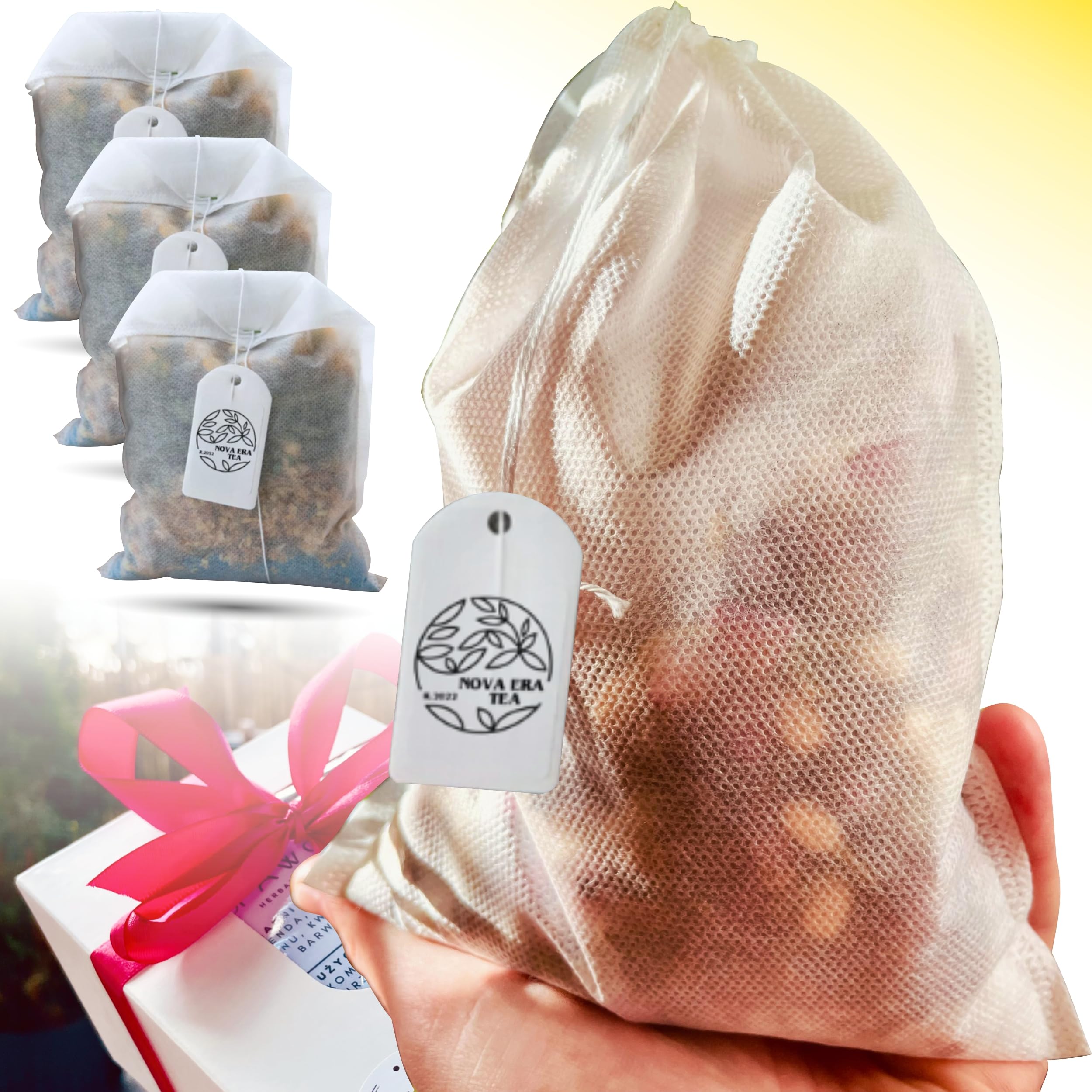 Features: Sea Salt: Helps cleanse body cells, eliminate toxins, and improve well-being. Cinnamon: Has a positive effect on blood and lymphatic circulation and therefore has anti-cellulite properties. Orange: Improves skin tone and helps treat acne, seborrhea, psoriasis, and other bacterial skin inflammations. Essential Oils: Help relieve nervous tension, improve sleep, and strengthen the immune system. Tea: Tightens blood vessels and helps fight aging. Features: Sea Salt: Helps cleanse body cells, eliminate toxins, and improve well-being. Rose Extract: The flower extract has anti-inflammatory, analgesic, antibacterial, antiviral, and antifungal properties. Orange – Improves skin tone and helps treat acne, seborrhea, psoriasis, and other bacterial skin inflammations. Essential oils: Help relieve nervous tension, improve sleep, and boost the immune system. Green tea: Constricts blood vessels and helps fight aging. Features: Sea salt: Helps cleanse body cells, eliminates toxins, and improves well-being. Rose extract: The flower extract has anti-inflammatory, analgesic, antibacterial, antiviral, and antifungal properties. Jasmine flowers: Soften and moisturize the skin. Klitoria flowers: Calming, stabilizes mood, and relieves joint pain. Essential oils: Help relieve nervous tension, improve sleep, and boost the immune system. Features: Sea salt: Helps cleanse the body's cells, eliminates toxins, and improves well-being. Pine needles: Known for their soothing effects on respiratory inflammation. Pine buds: Thanks to their high antioxidant content, they have a bactericidal and disinfectant effect. Apple: Puts you in a good mood and helps you forget your daily problems. Essential oils: Help relieve nervous tension, improve sleep, and strengthen the immune system. Tea: Tightens blood vessels and helps fight aging. Features: Sea salt: Helps cleanse the body's cells, eliminates toxins, and improves well-being. Mint: Relieves pain and has an analgesic and anti-inflammatory effect. Lavender: Soothes the nervous system. Essential oils: Help relieve nervous tension, improve sleep, and strengthen the immune system. Green tea: constricts blood vessels and helps fight aging. INGREDIENTS Himalayan saltDepending on the tea selected: DETOX, ENERGY, FLOWERS, FOREST, RELAX – The tea eliminates toxins and improves well-being, leaving skin soft and moisturized, helping to relieve nervous tension, improving sleep, and strengthening the immune system! Fill the bathtub with water at a comfortable temperature, insert a tea bag (steep for 8 minutes), and enjoy the water's benefits. Add shower gel and use the tea as a sponge. For body and mind: essential oils develop their soothing and revitalizing effect in the warmth of the bathwater, perfect for relieving stress. Promotes healthy skin and cell regeneration. ✓ 100 VERSATILE – 100 NATURAL CARE: free of parabens, artificial colors, or chemical additives – ideal for sensitive and dry skin. Leaves no residue on the bathtub or skin. Handmade bath tea with Himalayan salt. This is sea salt and dried flowers packaged in unique tea bags. Now you can prepare a relaxing bath with a pleasant fragrance and beneficial properties.Nova Era Tea - Thé de bain naturel fait main - Aromathérapie, ingrédients naturels - Sel de l'Himalaya, huiles essentielles, herbes - Soin de la peau, relaxation, bain de bien-être (lot de 3) Set 3DESCRIPTION DU PRODUIT DESCRIPTION DU PRODUIT Caractéristiques : Sel de mer : aide à nettoyer les cellules du corps, élimine les toxines et améliore le bien-être. Cannelle : a un effet positif sur la circulation sanguine et lymphatique dans le corps et a donc des propriétés anti-cellulite. Orange - Améliore le teint de la peau et aide à traiter l'acné, la séborrhée, le psoriasis et d'autres inflammations bactériennes de la peau. Huiles essentielles : aident à soulager la tension nerveuse, à améliorer le sommeil ou à renforcer le système immunitaire. Thé : resserre les vaisseaux sanguins et aide à lutter contre le vieillissement. Caractéristiques : Sel de mer : aide à nettoyer les cellules du corps, élimine les toxines et améliore le bien-être. Extrait de rose : l'extrait de fleur a des propriétés anti-inflammatoires, analgésiques, antibactériennes, antivirales et antifongiques. Orange - Améliore le teint de la peau et aide à traiter l'acné, la séborrhée, le psoriasis et d'autres inflammations bactériennes de la peau. Huiles essentielles : aident à soulager la tension nerveuse, à améliorer le sommeil ou à renforcer le système immunitaire. Thé vert : rétrécit les vaisseaux sanguins et aide à lutter contre le vieillissement. Caractéristiques : Sel de mer : aide à nettoyer les cellules du corps, élimine les toxines et améliore le bien-être. Extrait de rose : l'extrait de fleur a des propriétés anti-inflammatoires, analgésiques, antibactériennes, antivirales et antifongiques. Fleurs de jasmin : adoucissent et hydratent la peau. Fleurs de Klitoria : calmant, stabilise l'humeur et soulage les douleurs articulaires. Huiles essentielles : aident à soulager la tension nerveuse, à améliorer le sommeil ou à renforcer le système immunitaire. Caractéristiques : Sel de mer : aide à nettoyer les cellules du corps, élimine les toxines et améliore le bien-être. Aiguilles de pin : connues pour leurs effets soulageant les inflammations des voies respiratoires. Bourgeons de pin : grâce à leur teneur élevée en antioxydants, ils ont un effet bactéricide et désinfectant. Apple : vous met de bonne humeur et vous fait oublier les problèmes quotidiens. Huiles essentielles : aident à soulager la tension nerveuse, à améliorer le sommeil ou à renforcer le système immunitaire. Thé : resserre les vaisseaux sanguins et aide à lutter contre le vieillissement. Caractéristiques : Sel de mer : aide à nettoyer les cellules du corps, élimine les toxines et améliore le bien-être. Menthe : soulage la douleu