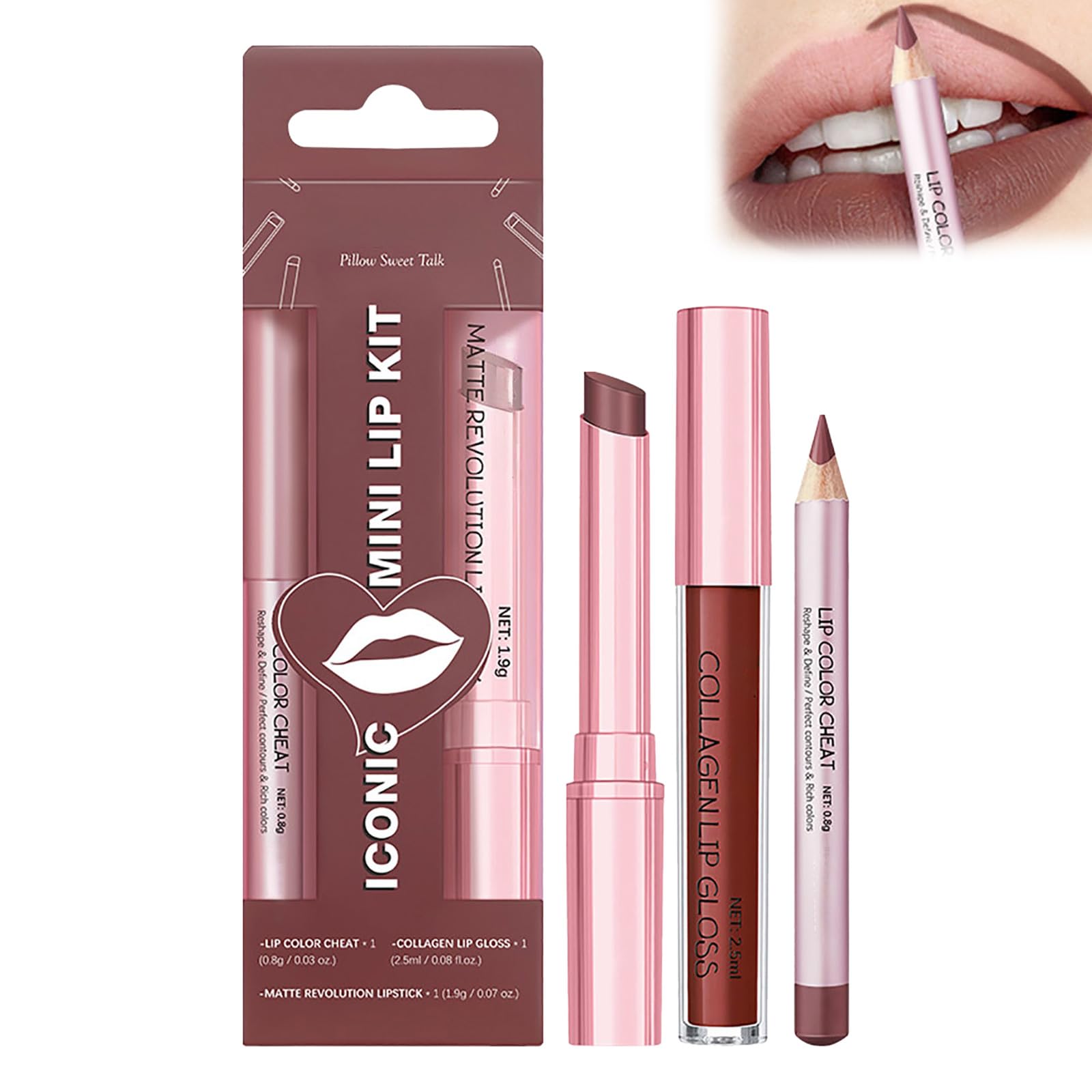 Color: As shown in the picture (Due to differences between monitors, there may be a slight color variation. Please only order if you accept this margin of error. Thank you.) Package Weight: 48 g Package Size: 15 x 15 x 1 cm (There may be a 1-3 mm error due to manual measurement. Please make sure you agree to this before ordering.) SAFETY WARNING For use onlyAll-in-one lip kit: For everyone, whether you're a woman or a student, a makeup beginner or a makeup artist, this product is for you. Perfect packaging: The lipstick kit makes a great birthday gift for friends or family. It's suitable for various occasions, such as dates, parties, weddings, bars, dance events, camping, the office, school, or everyday makeup. High-coverage lip color: This long-lasting liquid lipstick won't clump, dry out, or flake. It delivers the highly pigmented color of a lipstick, glides on like a gloss, and moisturizes like a lip balm. Waterproof and fade-resistant: This innovative formula gives lips a touch of shine, provides full matte coverage, is soft and long-lasting like silk, waterproof, doesn't easily fade, doesn't stick to cups, and has a velvety matte finish. Pink lip pencil kit: lip gloss, pink lip balm and lip liner in one step for full, sexy, seductive lips.Lot de 3 rouges à lèvres liquides mats, baume à lèvres et crayon à lèvres, baume à lèvres hydratant teinté rose, brillant à lèvres collagène, pour lèvres sèches, waterproof (café)DESCRIPTION DU PRODUIT DESCRIPTION DU PRODUIT Couleur : comme sur l'image (en raison des différences entre les différents moniteurs, il peut y avoir une légère différence de couleur. Merci de ne commander que si vous acceptez cette marge d'erreur. Merci beaucoup). Poids du colis : 48 g. Taille du paquet : 15 x 15 x 1 cm (il peut y avoir une erreur de 1 à 3 mm en raison de la mesure manuelle. Veuillez vous assurer que vous êtes d'accord avec cela avant de commander. AVERTISSEMENT DE SÉCURITÉ À utiliser uniquementKit de lèvres tout-en-un : pour tout le monde, que vous soyez une femme ou une étudiante, que vous soyez débutant en maquillage ou artiste de maquillage. Vous pouvez choisir ce produit. Emballage parfait : le kit de rouge à lèvres est adapté comme cadeau d'anniversaire pour les amis ou la famille. Il convient à différentes occasions, par exemple les rendez-vous, les fêtes, les mariages, les bars, les événements de danse, le camping, le bureau, l'école ou le maquillage quotidien. Couleur des lèvres très couvrante : ce rouge à lèvres liquide durable ne s'agglutine pas, ne sèche pas et ne s'écaille pas. Il offre la couleur hautement pigmentée d'un rouge à lèvres, glisse comme un gloss et hydrate comme un baume à lèvres. Imperméable et résistant à la décoloration : cette formule innovante donne aux lèvres une touche de brillance, obtient une couverture mate complète, est douce et durable comme la soie, imperméable, ne se décolore pas facilement, ne colle pas à la tasse et a un effet velours mat. Kit crayon à lèvres rose : gloss à lèvres, baume à lèvres rose et crayon contour des lèvres en une seule étape pour des lèvres pleines et sexy pleines de séduction.