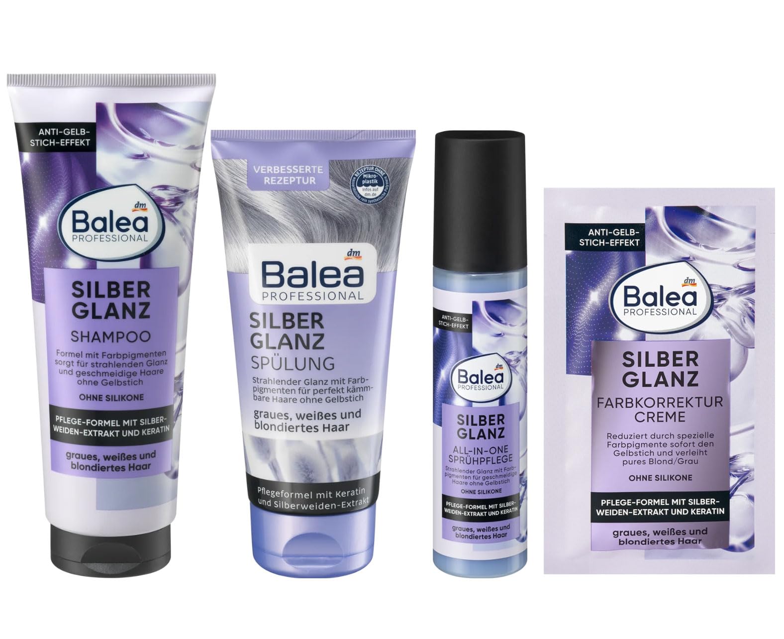 Balea Professional Silver Shine Shampoo 250 ml Caring formula with silver willow extract and keratin. For gray, white, and blonde hair. Anti-yellowing effect. Silicone-free. Balea Professional's Silver Shine Shampoo delivers ultimate silver shine to blonde and gray hair thanks to its powerful formula. The caring formula with silver willow extract and keratin gently cleanses the hair and ensures a brilliant silver shine right down to the tips. Special color pigments enhance the brilliant silver shine. Formula free of microplastics and water-soluble synthetic polymers. Balea Professional Silver Shine Conditioner 200 ml Brilliant shine with color pigments for perfectly manageable hair without yellow tones. For gray, white, and blonde hair. Keratin and silver willow extract conditioning formula. Improved silicone-free formula. Dermatologically tested for skin tolerance. Shiny silver. Brilliant. Ultimate. Balea Professional's Silver Shine Conditioner has a powerful formula for noticeable, visible results. The conditioner gives blonde and gray hair a brilliant shine—without any yellow tint—and the conditioning formula enhances the silver's brilliant luster. Furthermore, the conditioner is made with gentle conditioning ingredients that won't damage the scalp for optimal detangling. Hair-building minerals like keratin accumulate in the hair structure, helping to strengthen hair fibers and improve hair quality. Formulated without microplastics or synthetic polymers purely water-soluble. Balea Professional Silver Shine Color Correcting Cream 20 ml Conditioning formula with silver willow extract and keratin. For gray, soft, and blonde hair. Anti-yellowing effect. Silicone-free. Silver and radiant shine: Balea Professional Silver Shine Color Correcting Cream impresses with its powerful formula for noticeable and visible results. It instantly reduces yellowing and provides long-lasting pure blonde or gray. Formula free of microplastics and water-soluble synthetic polymers. Balea Professional Silver Shine Conditioning Spray 150 ml Conditioning formula with silver willow extract and keratin. For gray, white, and blonde hair. Anti-yellowing effect. Silicone-free. Balea Silver Shine Professional Conditioning Spray nourishes and strengthens hair, moisturizes it, and leaves it supple. It improves detangling and protects against frizz and heat up to 230 C. For radiant shine on blonde and gray hair. DIRECTIONS FOR USE 1. Wet hair. 2. Apply shampoo to hair and massage. 3. Rinse thoroughly. 4. Apply conditioner to hair, leave on, and rinse. 5. (Optional) Apply a color-correcting cream or spray treatment as needed. SAFETY WARNING Gently massage into wet hair, leave on briefly, and rinse thoroughly. Note: Avoid contact with eyes. If contact occurs, rinse eyes thoroughly with water. If the product comes into contact with other materials (textiles, sanitary fixtures), clean thoroughly afterward. Not suitable for naturally blonde hair. See moreBalea Professional's Silver Shine shampoo delivers ultimate silver shine to blonde and gray hair thanks to its powerful formula. Brilliant silver. Brilliant. Ultimate. Balea Professional's Silver Shine conditioner has a powerful formula for noticeable and visible results. Brilliant silver shine: Balea Professional's silver color-correcting cream impresses with its powerful formula for noticeable and visible results. Balea Silver Shine professional spray treatment nourishes and strengthens hair, hydrates it, and leaves it supple.Lot de 4 : shampoing argenté brillant 250 ml après-shampoing argenté brillant 200 ml spray d'entretien argenté brillant 150 ml crème correctrice de couleur argentée brillante 20 mlDESCRIPTION DU PRODUIT DESCRIPTION DU PRODUIT Balea Professional Shampooing Silver Brillance 250 ml Formule de soin à l'extrait de saule argenté et à la kératine. Pour cheveux gris, blancs et blonds. Effet anti-jaunissement. Sans silicone. Le shampooing Silver Shine de Balea Professional offre une brillance argentée ultime aux cheveux blonds et gris grâce à sa formule puissante. La formule de soin à l'extrait de saule argenté et à la kératine nettoie les cheveux en douceur et assure une brillance argentée éclatante jusqu'aux pointes. Des pigments de couleur spéciaux soutiennent la brillance brillante de l'argent. Formule sans microplastiques ni polymères synthétiques solubles dans l'eau. Balea Professional Après-shampoing argenté brillant 200 ml Brillance éclatante avec pigments de couleur pour des cheveux parfaitement coiffables sans reflets jaunes. Pour cheveux gris, blancs et blonds. Formule de soin à la kératine et à l'extrait de saule argenté. Formule améliorée sans silicone. Tolérance cutanée testée dermatologiquement. Argent brillant. Brillant. Ultimate L'après-shampoing Silver Shine de Balea Professional possède une formule puissante pour un résultat perceptible et visible. L'après-shampoing donne une brillance éclatante aux cheveux blonds et gris – sans teinte jaune – et la formule de soin soutient la brillance brillante de l'argent. De plus, l'après-shampoing est fabriqué avec des ingrédients de soin doux qui n'abîment pas le cuir chevelu pour un démêlage optimal. Les pierres de cheveux telles que la kératine s'accumulent dans la structure du cheveu, aident à renforcer les fibres capillaires et à améliorer la qualité des cheveux. Formule sans microplastiques et polymères synthétiques purement solubles dans l'eau. Balea Professional Crème Correcteur de Couleur Argent Brillant 20 ml Formule de soin à l'extrait de saule argenté et à la kératine. Pour cheveux gris, doux et blonds. Effet anti-jaunissement. Sans silicone. Brillance argentée et éclatante : la crème correctrice de couleur argentée Balea Professional convainc par sa formule puissante pour un résultat perceptible et visible. Il réduit instantanément le jaunissement et donne un blond pur ou gris longue durée. Formule sans microplastiques 