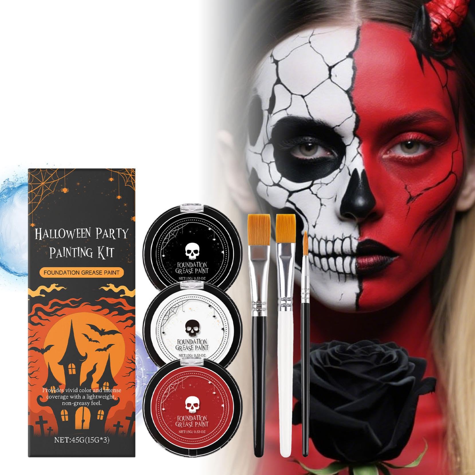 Specifications: Product Name: Body Makeup Kit Net Contents: 3 x 15g Shelf Life: 3 years Package Contents: 1 Body Makeup Kit SAFETY WARNING NOComplete Children's Makeup Kit: Contains 3 tins of body paint (white, black, red, 15g each) and 3 professional brushes (2 flat brushes and 1 eyeliner brush). This provides everything you need for creative designs and impressive Halloween makeup. Easy Cleanup and Versatile Use: This theatrical makeup kit washes off easily with soapy water or regular makeup remover after the party. Ideal for Halloween makeup, stage performances, carnival makeup, children's makeup, or cosplay. Gentle and Skin-Friendly for Children and Adults: The makeup is made from tested, skin-friendly ingredients. It is safe for both adults and children. An allergy test is recommended before first use. Long-Lasting, Waterproof, and Sweatproof: Our makeup is ideal for long nights and stays put even with movement or lighting. This children's makeup kit is perfect for Halloween, carnival, or Mardi Gras. Highly pigmented and easy to use: This Halloween makeup kit contains white, black, and red (15g each) with high color intensity. The soft texture applies evenly, perfect for children's makeup, theatrical makeup, or creative party looks.Maquillage d'Halloween blanc, noir, rouge, 45 g, pour enfants et adultes, maquillage de théâtre, haute intensité, imperméable et résistant à la transpiration, doux et doux pour la peauDESCRIPTION DU PRODUIT DESCRIPTION DU PRODUIT Spécifications: Nom du produit : kit de maquillage pour le corps. Contenu net : 3 x 15 g. Durée de vie : 3 ans. Contenu de l'emballage : 1 kit de maquillage pour le corps. AVERTISSEMENT DE SÉCURITÉ NOKit complet de maquillage pour enfants : contient 3 boîtes de peinture corporelle (blanc, noir, rouge 15 g chacune) ainsi que 3 pinceaux professionnels (2 pinceaux plats et 1 pinceau à eyeliner). Vous avez ainsi tout ce dont vous avez besoin pour des designs créatifs et un maquillage d'Halloween impressionnant. Nettoyage facile et utilisation polyvalente : ce kit de maquillage de théâtre se lave facilement avec de l'eau savonneuse ou un démaquillant ordinaire après la fête. Idéal pour le maquillage d'Halloween, les spectacles sur scène, le maquillage de carnaval, le maquillage des enfants ou le cosplay. Doux et doux pour la peau pour les enfants et les adultes : le maquillage est fabriqué à partir d'ingrédients testés et respectueux de la peau. Il est sans danger pour les adultes et les enfants. Un test d'allergie est recommandé avant la première utilisation. Durable, imperméable et résistant à la transpiration : notre maquillage est idéal pour les longues nuits, reste stable même en cas de mouvement ou d'éclairage. Ainsi, ce kit de maquillage pour enfants est parfait pour Halloween, le carnaval ou le carnaval. Couleurs hautement pigmentées et facile à utiliser : ce kit de maquillage d'Halloween contient du blanc, du noir et du rouge (15 g chacun) avec une intensité de couleur élevée. La texture douce s'applique uniformément, parfait pour le maquillage des enfants, le maquillage de théâtre ou les looks de fête créatifs.