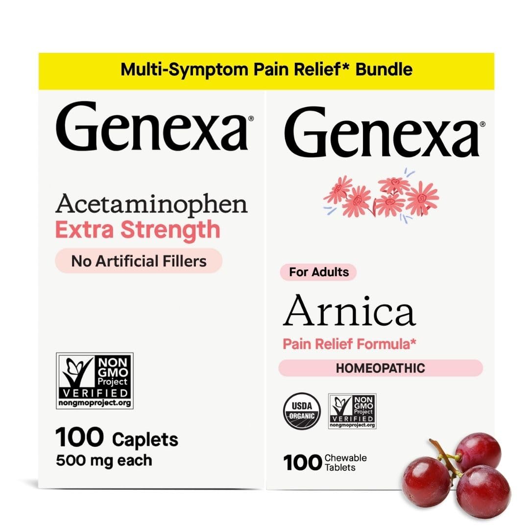 This duo includes Genexa Extra Strength Acetaminophen and Genexa Homeopathic Arnica Pain Relief, formulated to target a wide range of discomforts . The 500mg acetaminophen caplets provide powerful relief from headaches, backaches, arthritis, menstrual cramps, and fever for adults and kids 12 . The physician-formulated Arnica chewable tablets are formulated to ease muscle soreness, joint stiffness, bruising, swelling, and pain from minor injuries or overexertion . Designed with your lifestyle in mind, this bundle features smooth-coated caplets (acetaminophen) and tasty grape-flavored chewables (arnica), making it easy and enjoyable to use —whether at home or on the go. Both are made without artificial sweeteners, artificial preservatives, dyes, parabens, artificial flavors, or common allergens. The acetaminophen delivers the same effective relief as leading brands, without artificial fillers or dyes, while the Arnica is certified vegan, non-GMO, gluten-free, and lactose-free. Both formulas reflect Genexa's commitment to clean remedies you can trust for your family. Claims based on traditional homeopathic practice, not accepted medical evidence. Not evaluated by the Food and Drug Administration.Medicine made clean: Both formulas are free from artificial sweeteners, artificial preservatives, dyes, parabens, artificial flavors, and common allergens —providing clean, relief without any unwanted additives. Convenient Easy-to-use: Genexa's pain relief bundle provides convenient and hassle-free dosing. Extra Strength Acetaminophen caplets are easy to swallow, with a smooth coating and streamlined design. Arnica for Pain Relief is made with a tasty grape flavor in a convenient chewable tablet. Fit for at home or on-the-go. Arnica for Pain Relief: This organic blend of homeopathic ingredients is formulated to address muscle pain and stiffness due to minor injuries, overexertion and falls. It also addresses pain, swelling, and discoloration from bruises. Extra Strength Acetaminophen: Delivers the same effective 500mg acetaminophen as leading brands without artificial fillers or dyes providing comprehensive pain relief for adults kids 12 , reduces fever and relieves headaches, minor arthritis pain, and premenstrual and menstrual cramps pain.
