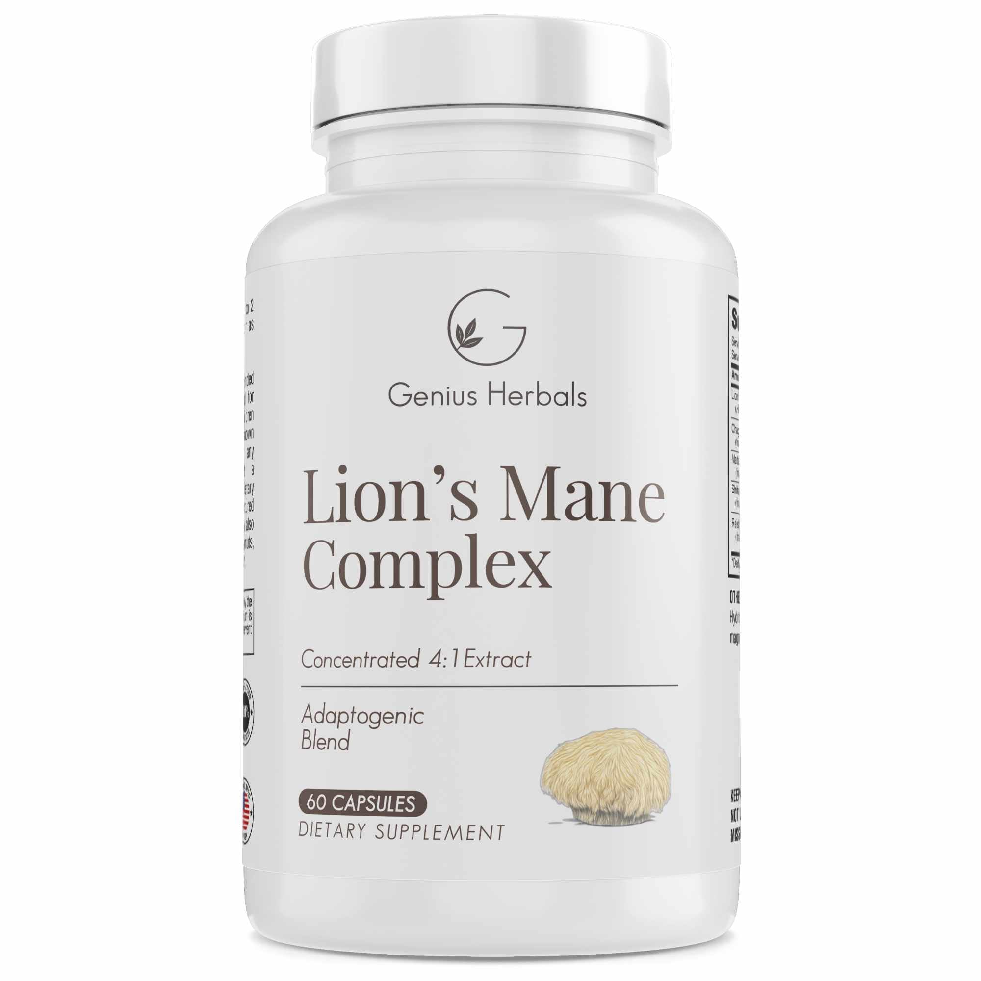 GENIUS HERBALS Lions Mane Complex - Concentrated 4:1 Extract for Brain Health Cognitive and Memory Support - 60 Capsules