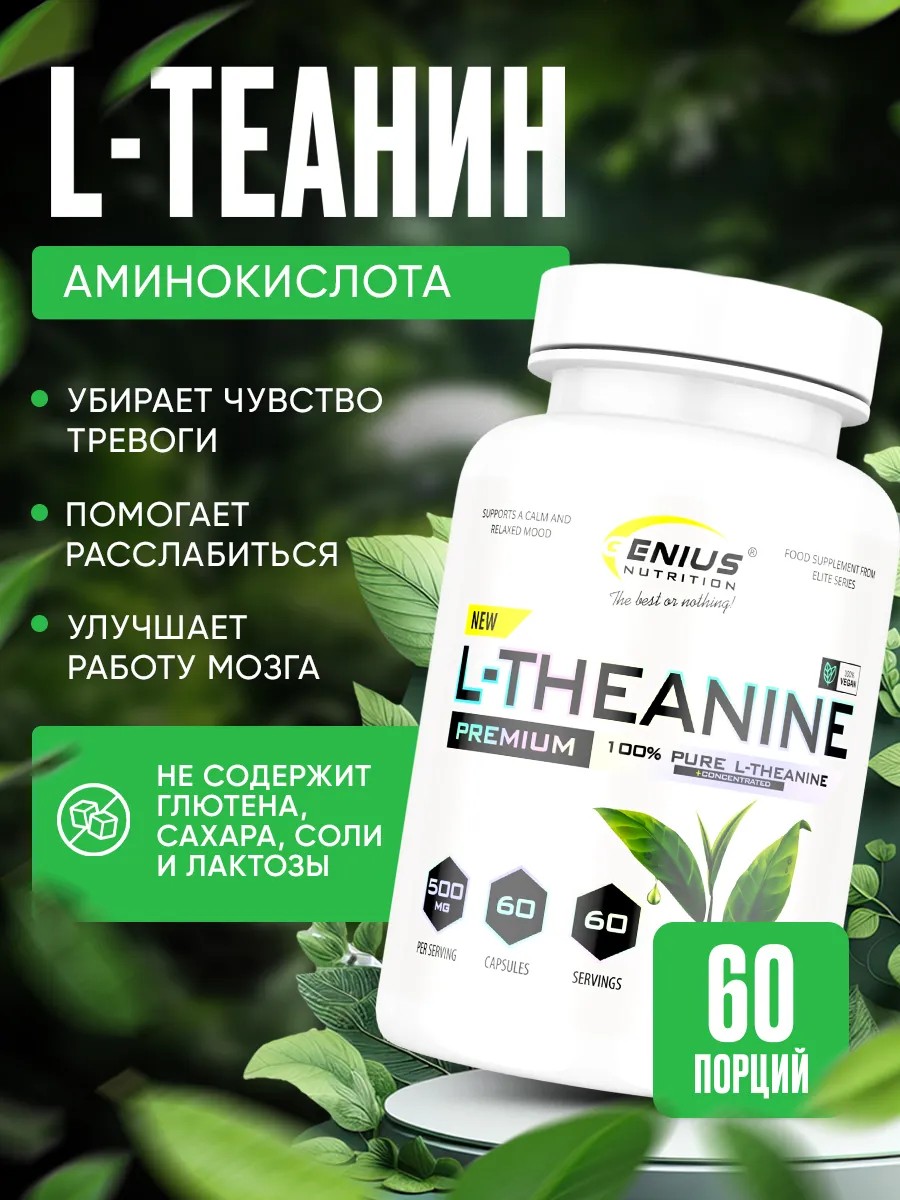 Дополните свой ежедневный рацион капсулами Genius Nutrition по 500 мг L-теанина. Предлагается в удобной бутылочке на 60 грамм и специально разработан для мягкого воздействия, способствующего расслаблению без сонливости.