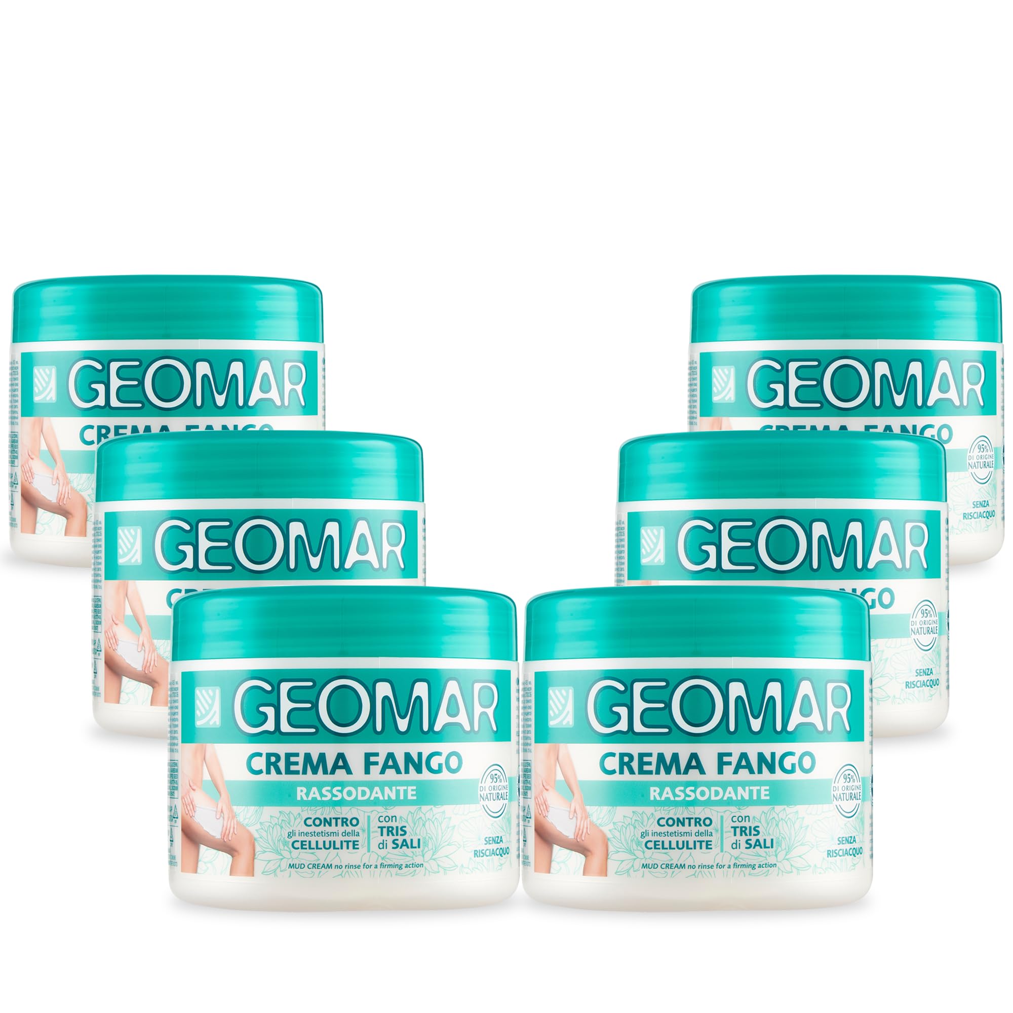 FIRMING MUD CREAM: Its enriched formula, with over 95 naturally derived ingredients, contains Dead Sea trace elements, three salts (sea salt, Epsom salt, and Dead Sea salt) with well-known osmotic and draining properties, green, black, and white clay which contribute to its detoxifying and draining action, and phytoextracts of Ginkgo Biloba, grape, and green coffee which, thanks to the synergistic action of massage, help drain excess fluids. USE: Apply the product to problem areas such as thighs, buttocks, hips, arms, and stomach. Massage in circular motions from the bottom up until completely absorbed. Use twice a day, morning and evening, for at least two consecutive months. Ideal for use in combination with mud baths to enhance their effectiveness. RESULTS: From the first applications, skin appears firmer and more hydrated. Continued use diminishes the appearance of skin imperfections caused by cellulite: improved microcirculation is observed, resulting in a significant reduction in the appearance of orange peel skin. Skin appears firmer and smoother. PRECAUTIONS FOR USE: Do not use on broken or irritated skin. DERMATOLOGICALLY TESTED. DOES NOT CONTAIN IODIC SOURCES FROM ALGAE. SAFETY WARNING: Do not use on broken or irritated skin.GEOMAR: an Italian brand born from the meeting of EARTH and SEA, inspired by the world of professional aesthetics, yet manufacturing effective products with benefits derived from nature. Body care and treatment products containing the extraordinary resources of the Dead Sea. DIRECTIONS FOR USE: Apply the product to problem areas such as thighs, buttocks, hips, arms, and stomach. Massage in circular motions from the bottom up until completely absorbed. Use twice a day, morning and evening, for at least two consecutive months. Ideal for use in combination with mud baths to enhance their effectiveness. RESULTS: From the first applications, skin appears firmer and hydrated. Continued use diminishes the appearance of skin imperfections caused by cellulite: there is an improvement in skin microcirculation with a consequent reduction in the appearance of orange peel skin. Skin appears firmer and smoother. NATURAL ORIGIN: With 95 naturally derived ingredients, it contains Dead Sea trace elements, three salts (sea salt, Epsom salt, and Dead Sea salt), and green, black, and white clay, which contribute to its detoxifying and draining action. Phytoextracts of Ginkgo Biloba, Grape, and Green Coffee help drain excess fluids. Vegan formula, dermatologically tested, and Made in Italy. ANTI-CELLULITE, FIRMING: A firming mud cream that helps reduce the appearance of cellulite. Ideal for taking advantage of the osmodynamic properties of natural salts, which help combat water retention, reduce the appearance of orange peel skin, and drain excess fluids retained in the skin tissue.GEOMAR Crème de Boue Raffermissante contre la Cellulite, 95 d'origine Naturelle avec trois Sels (Sel de Mer, Sel d'Epsom et Sel de la Mer Morte), Sans Rinçage, Made in Italy, 6 x 450 ml 450 ml (Lot de 6)DESCRIPTION DU PRODUIT DESCRIPTION DU PRODUIT CREME DE BOUE RAFFERMISSANTE: sa formule enrichie, avec plus de 95 d'ingrédients d'origine naturelle, contient des oligo-éléments de la Mer Morte, trois sels (sel de mer, sel d'Epsom et sel de la Mer Morte) aux propriétés osmotiques et drainantes bien connues, de l'argile verte, noire et blanche qui contribuent à l'action détoxifiante et drainante, des phytoextraits de Ginko Biloba, de raisin et de café vert qui, grâce à l'action synergique du massage, aident à drainer l'excès de liquides. UTILISATION: appliquer le produit sur les zones critiques telles que les cuisses, les fesses, les hanches, les bras et le ventre. Effectuer des massages circulaires du bas vers le haut jusqu'à absorption complète. Utiliser deux fois par jour, matin et soir, pendant au moins deux mois consécutifs. Idéal à combiner avec des bains de boue pour en renforcer l'efficacité. RÉSULTATS: Dès les premières applications, la peau apparaît compacte et hydratée. L'utilisation continue diminue la visibilité des imperfections cutanées causées par la cellulite: on observe une amélioration de la microcirculation cutanée avec une réduction conséquente de la visibilité de la peau d'orange. La peau paraît plus ferme et plus lisse. PRECAUTIONS D'EMPLOI: Ne pas utiliser sur une peau blessée ou irritée. TESTÉ DERMATOLOGIQUEMENT. NE CONTIENT PAS DE SOURCES D'IODE PROVENANT D'ALGUES AVERTISSEMENT DE SÉCURITÉ Ne pas utiliser sur une peau lésée ou irritée.GEOMAR: marque italienne née de la rencontre entre la TERRE et la MER, inspirée par le monde de l'esthétique professionnelle, mais fabriquant des produits efficaces aux bienfaits dérivés de la nature. Produits de soin et de traitement pour le corps contenant les ressources extraordinaires de la Mer Morte. MODE D'EMPLOI: Appliquer le produit sur les zones critiques telles que les cuisses, les fesses, les hanches, les bras et le ventre. Effectuer des massages circulaires du bas vers le haut, jusqu'à absorption complète. Utiliser deux fois par jour, matin et soir, pendant au moins deux mois consécutifs. Idéal à combiner avec les bains de boue pour en renforcer l'efficacité. RÉSULTATS: Dès les premières applications, la peau apparaît compacte et hydratée. L'utilisation continue diminue la visibilité des imperfections cutanées causées par la cellulite: il y a une amélioration de la microcirculation cutanée avec une réduction conséquente de la visibilité de la peau d'orange. La peau paraît plus ferme et plus lisse. ORIGINE NATURELLE: Avec 95 d'ingrédients d'origine naturelle, il contient des oligo-éléments de la Mer Morte, trois sels (sel de mer, sel d'Epsom et sel de la Mer Morte), de l'argile verte, noire et blanche qui contribuent à l'action détoxifiante et drainante. Des phytoextraits de Ginko Biloba, de Raisin et de Café Vert qui aident à drainer les liquides en excès. Formul