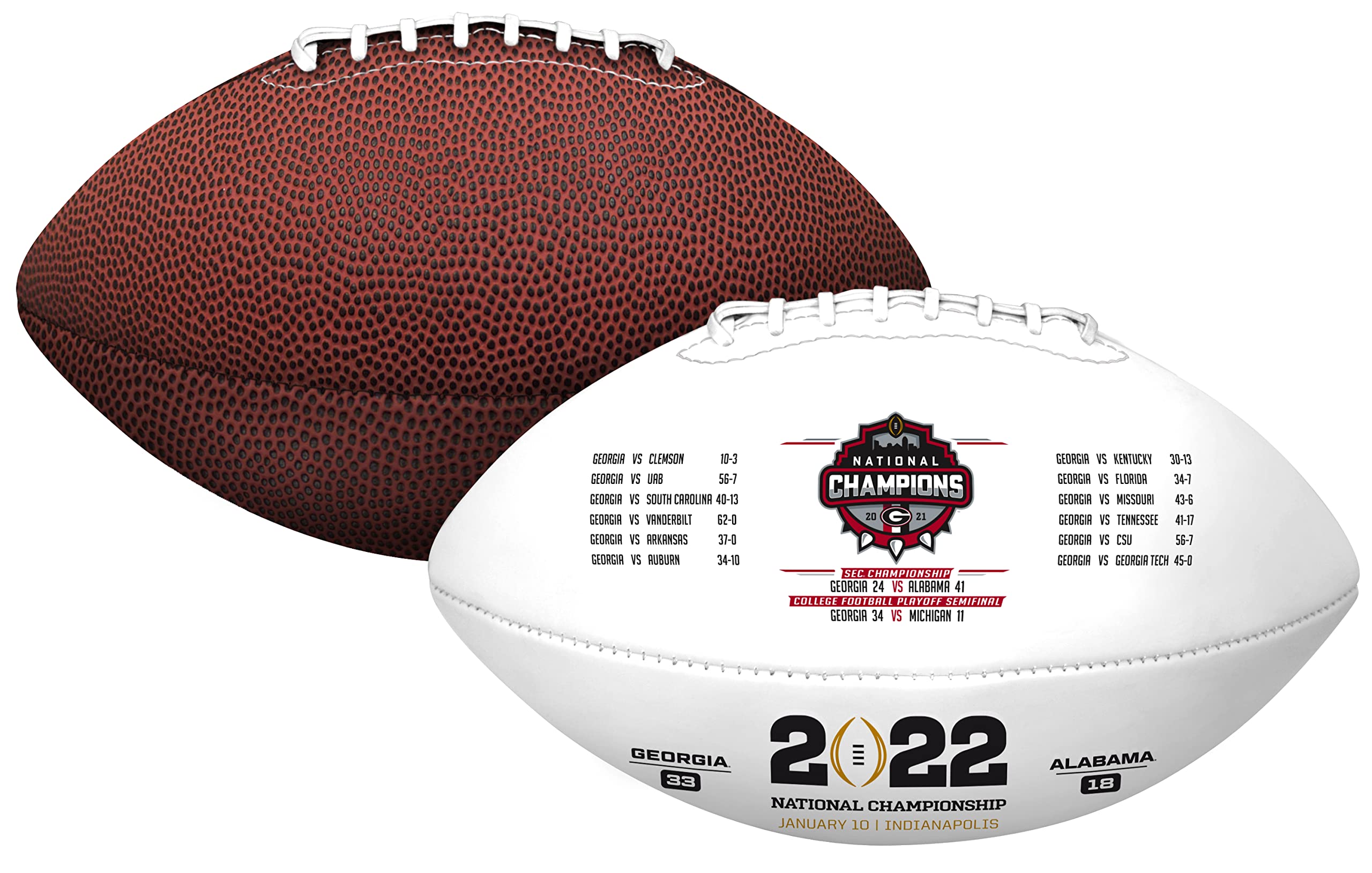 DIMENSIONS: 5" x 4.5" x 9". DISPLAY BOX INCLUDED | Youth size NCAA Champions footballs ship in Rawlings branded display box - Tee not included. GREAT FOR AUTOGRAPHS | Championship balls feature two white panels perfect for autographs. FEATURES INCLUDE | Official 2022 Team Championship Logo Mark, Score of Final Game, Score and results of every Gerogia game during the 2021-22 college football season. YOUTH SIZE FOOTBALL | Official 2022 NCAA College Football National Champions - Georgia Bulldogs.