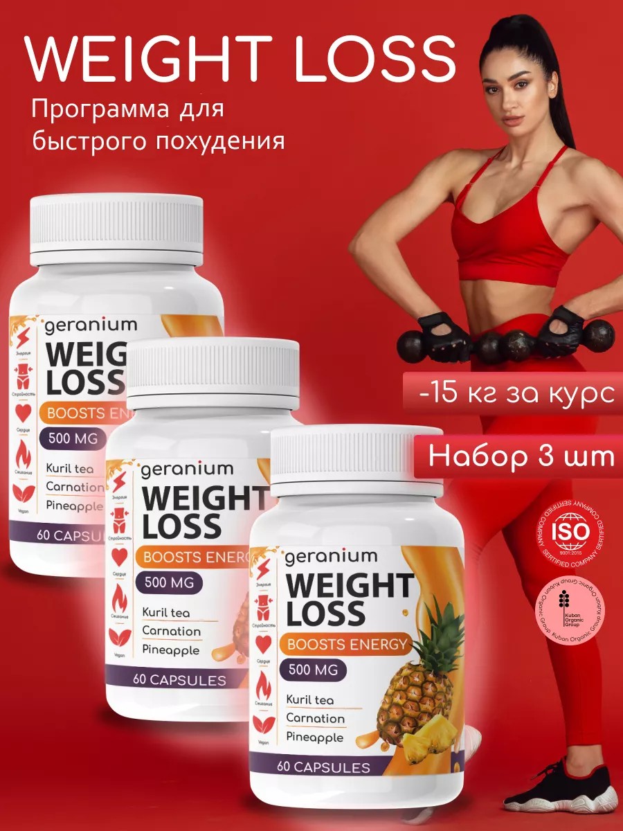 Geranium гераниум для похудения - пищевая добавка способная активировать эффективное жиросжигание. Это современное средство, обладающее рядом положительных качеств: безопасное жиросжигание в короткие сроки, избавление от подкожного и висцерального (внутреннего) жира, повышение энергичности, устранение сонливости и утомляемости, снижение тяги к вредной пище, очищение организма от шлаков и токсинов. Таблетки для похудения Гераниум Вейт Лосс имеют натуральный состав. Комплексный состав средства сжигает жировую массу. Показания для применения капсул: помогает как снизить аппетит, так и запустить похудение, преодолеть барьер тем, кто уже худеет и сталкивается с застоем. Средство для похудения применяется курсом в 1 месяц, при необходимости курс повторить через 30 дней. Для усиления результата рекомендуется соблюдать правильное питание с пониженным содержанием насыщенных жиров, а добавление физических нагрузок способствует стремительному похудению. В течение курса приема препарата требуется обильное питье (не менее 2 литров воды в день). «Geranium Weight loss» для снижения веса необходимо принимать по 1 капсуле, 2 раза в день (утром и вечером), независимо от приема пищи. Запивайте капсулу обильным количеством питьевой воды (100-150 мл.) Противопоказания: индивидуальная непереносимость компонентов, детский возраст до 18 лет, периоды беременности и кормления грудью.