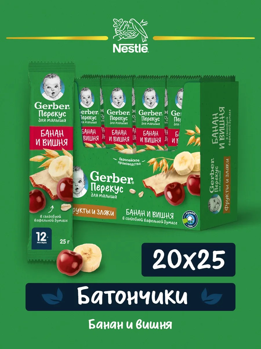 GERBER. Fruit and cereal bar with cherry and banana, from 12 months. 25g. Gerber Fruit and cereal bar with cherry and banana, 25g, for children over 12 months. Made without genetically modified ingredients, artificial preservatives, colors and flavors. Suitable for a healthy snack between meals. Fortified with calcium.