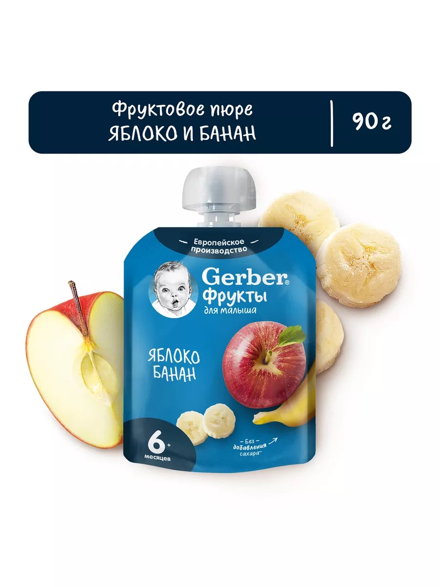 Фруктовое детское пюре Gerber яблоко банан с 6 месяцев 90 г - это вкусное и полезное питание для малышей, которое обеспечивает их гармоничное развитие и активный рост.