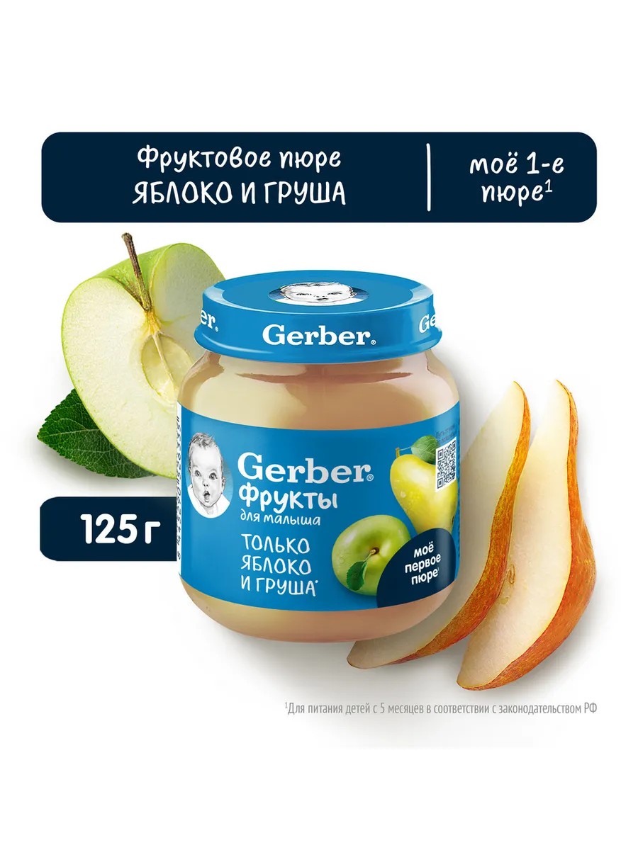 Gerber (Гербер) Фруктовое пюре из яблока и груши 125 г. для питания детей старше 5 месяцев согласно законодательству РФ.